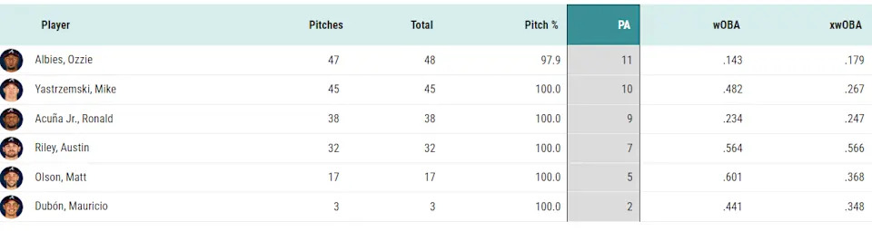 Though Michael Wacha’s been around forever, this Braves lineup only has 44 collective PAs across six batters against him, and only Ozzie Albies and Yastrzemski have double digits on that front, with 11 and 10, respectively. Austin Riley, Matt Olson, and Mauricio Dubon have all hit Wacha well in a tiny sample, while Albies and his buddy Ronald Acuña Jr. have not (also in a tiny sample).
