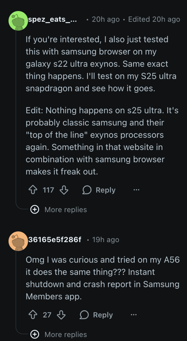The issue was put in the spotlight by a Galaxy S24 user on Reddit, who posted a video of the phone entirely restarting after opening that website. The comments are flooded with several users reporting the same thing. It’s not isolated to one specific model, and it’s happening for flagships such as the Galaxy S25 Ultra as well as recent midrange phones like the Galaxy A56.