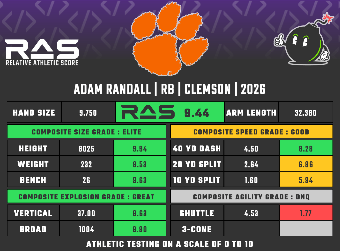 Randall, a former wide receiver, is new to his position, but his blend of size, top-end speed and pass-catching ability make him an intriguing prospect. He’s an upright long-strider with surprising one-cut quickness and home-run potential. He doesn’t run with pro-level rhythm, recognition or timing, but improvement awaits. He’s willful once he’s downhill, using balance and force to maximize yardage after collisions. His receiving skills create mismatches against man coverage and allow for alignment versatility. Randall is still raw, but RBs with his size, speed and route skill are rare. He offers value as a developmental option with RB2 upside in a zone-heavy scheme.