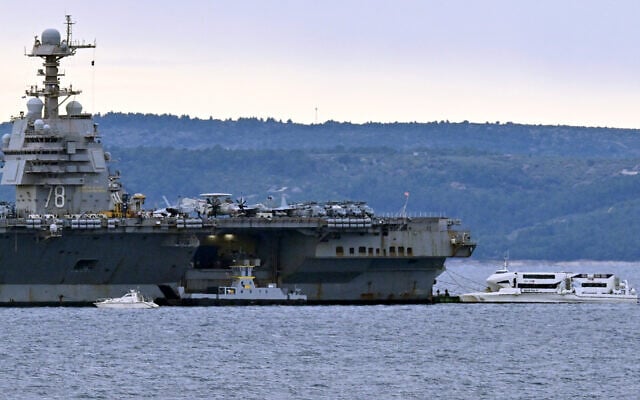 Harbor tugboats and other civilian vessels approach the US Navy aircraft carrier USS Gerald R. Ford at an anchor point off the Croatian coastal city of Split on March 28, 2026, for a scheduled port visit and maintenance stop following involvement in Middle East war operations. (ELVIS BARUKCIC / AFP)