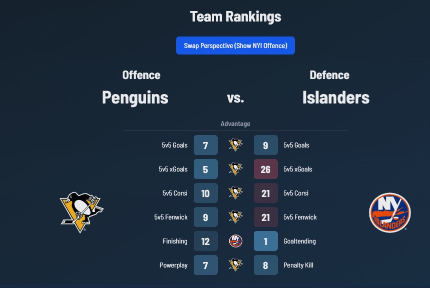 Tonight is not quite a true ‘must win’ situation for the Penguins or Islanders, but it’s getting mighty close to that territory. A result tonight in regulation would do wonders in the models for the winner’s chances and deal a major blow to whomever losses. An overtime game kicks the can down the road a bit more for the loser, and would be most unwelcome news for the folks in Columbus, Ottawa and Detroit to see the possibility of a three-point game.