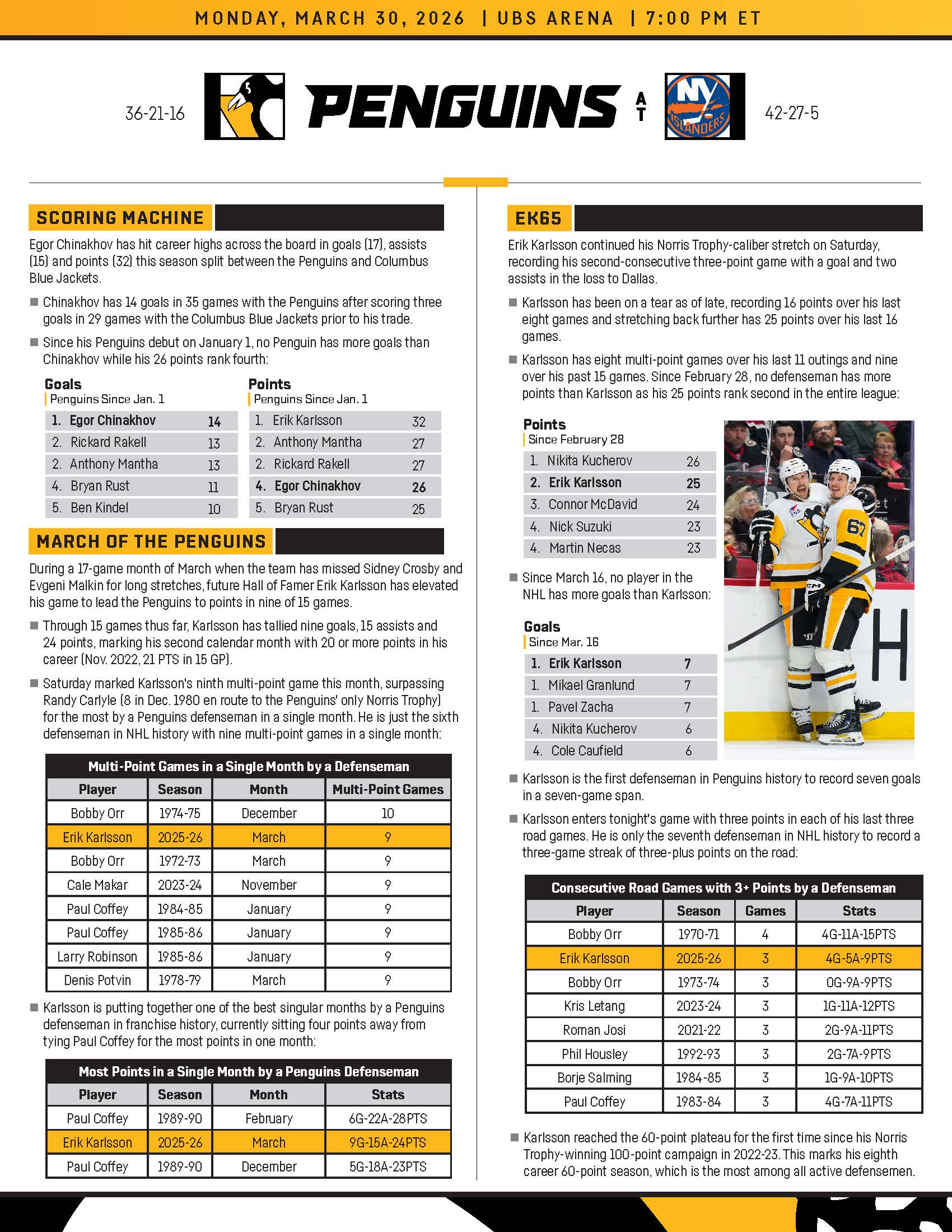 Who: Pittsburgh Penguins (36-21-16, 88 points, 3rd place Metropolitan Division) @ New York Islanders (42-27-5, 89 points, 2nd place Metropolitan Division)