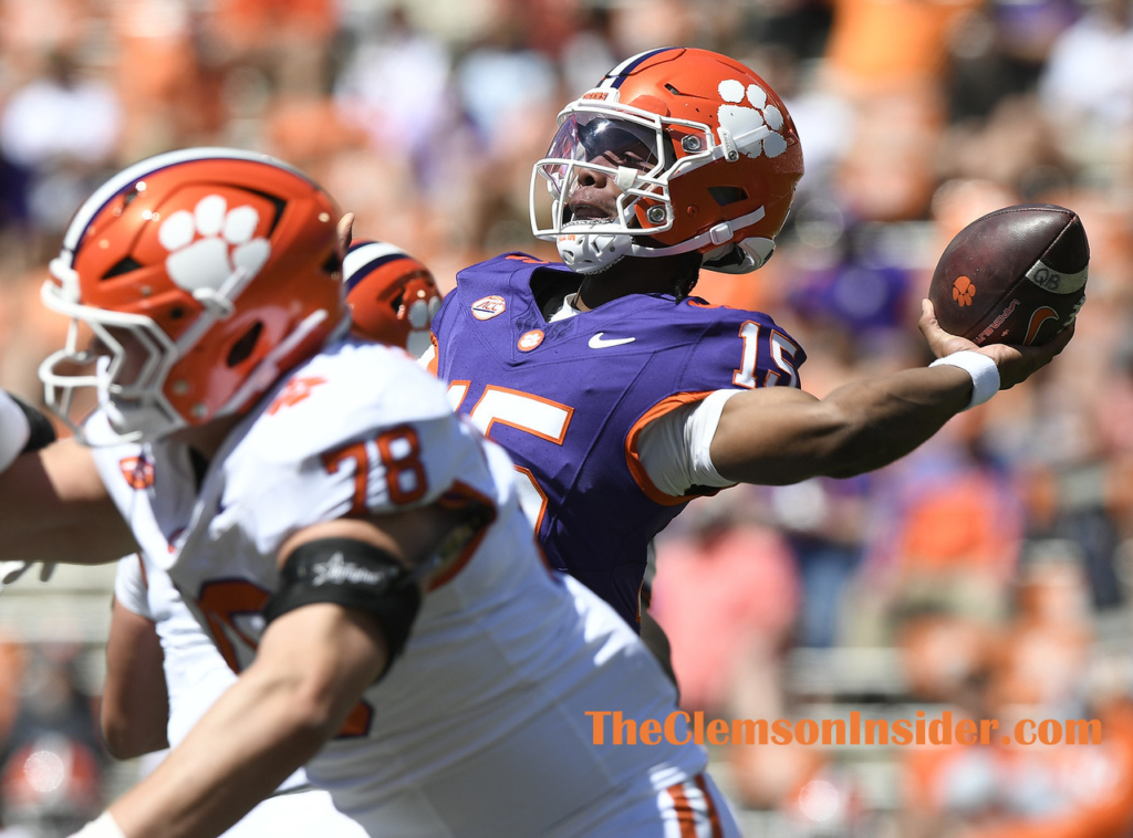 Clemson quarterback Chris Denson (15) throw a pass during Clemson’s annual Orange & White Spring Game on Saturday, March 28, 2026 at Memorial Stadium in Clemson, S.C. Denson finished the afternoon 2-for-5 for 3 yards, while running just once for minus-8 yards. (Bart Boatwright/The Clemson Insider)