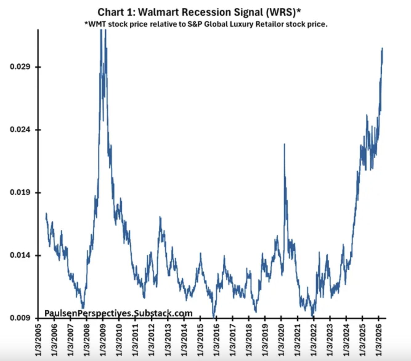 Paulsen, former chief investment strategist at investment research firm the Leuthold Group, devised an indicator he dubs the “Walmart Recession Signal” (WRS), which tracks the stock price of Walmart against the S&P Global Luxury Index, a basket of 80 companies producing or distributing luxury goods. He said that since economic downturns are usually felt first by lower-income individuals, an increase in Walmart’s stock price could indicate a potential economic downturn.