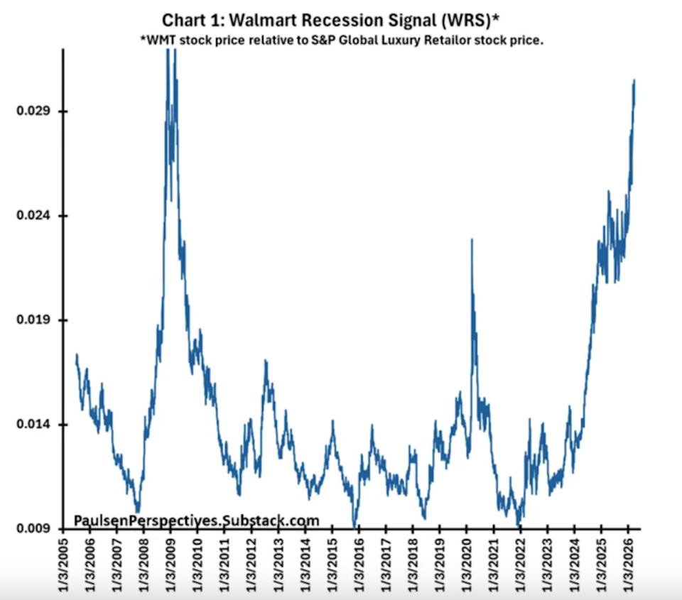 Paulsen, former chief investment strategist at investment research firm the Leuthold Group, devised an indicator he dubs the “Walmart Recession Signal” (WRS), which tracks the stock price of Walmart against the S&P Global Luxury Index, a basket of 80 companies producing or distributing luxury goods. He said that since economic downturns are usually felt first by lower-income individuals, an increase in Walmart’s stock price could indicate a potential economic downturn.