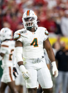 Bain came back healthy this past season, and the duo immediately put NFL scouts on notice as they disrupted a top Notre Dame offensive line early and often to open the year, notably sealing the Hurricanes’ Week 1 matchup by meeting at the quarterback twice in the final two plays before a Fighting Irish false start ran the final seconds off the clock. Both pass rushers would go on to enjoy the best production of their careers, shining especially bright on the biggest stage. In four CFP games against Texas A&M, Ohio State, Ole Miss, and Indiana, Mesidor recorded 5.5 sacks and 5.5 tackles for loss while Bain delivered five sacks and eight tackles for loss.