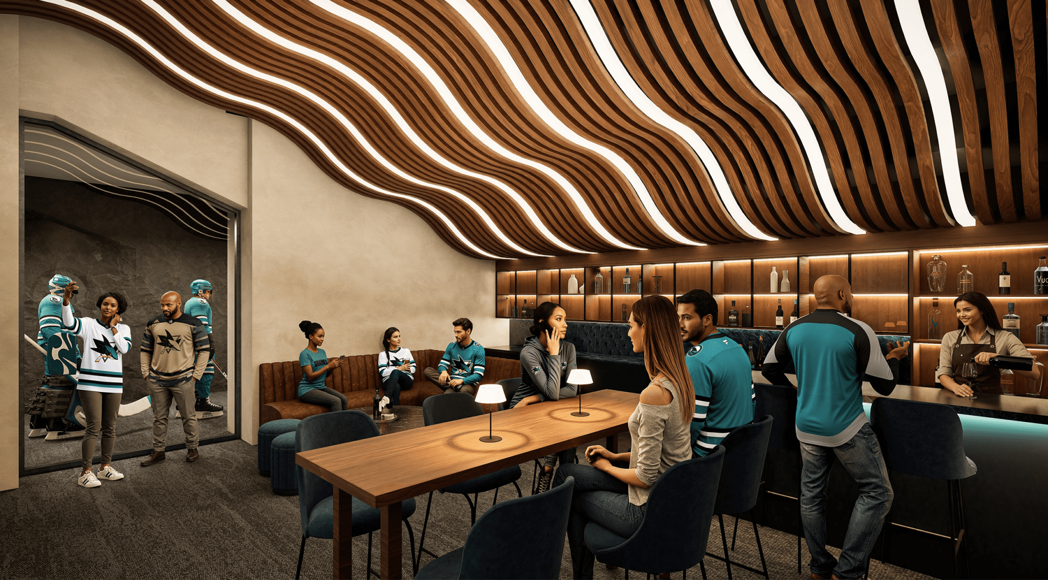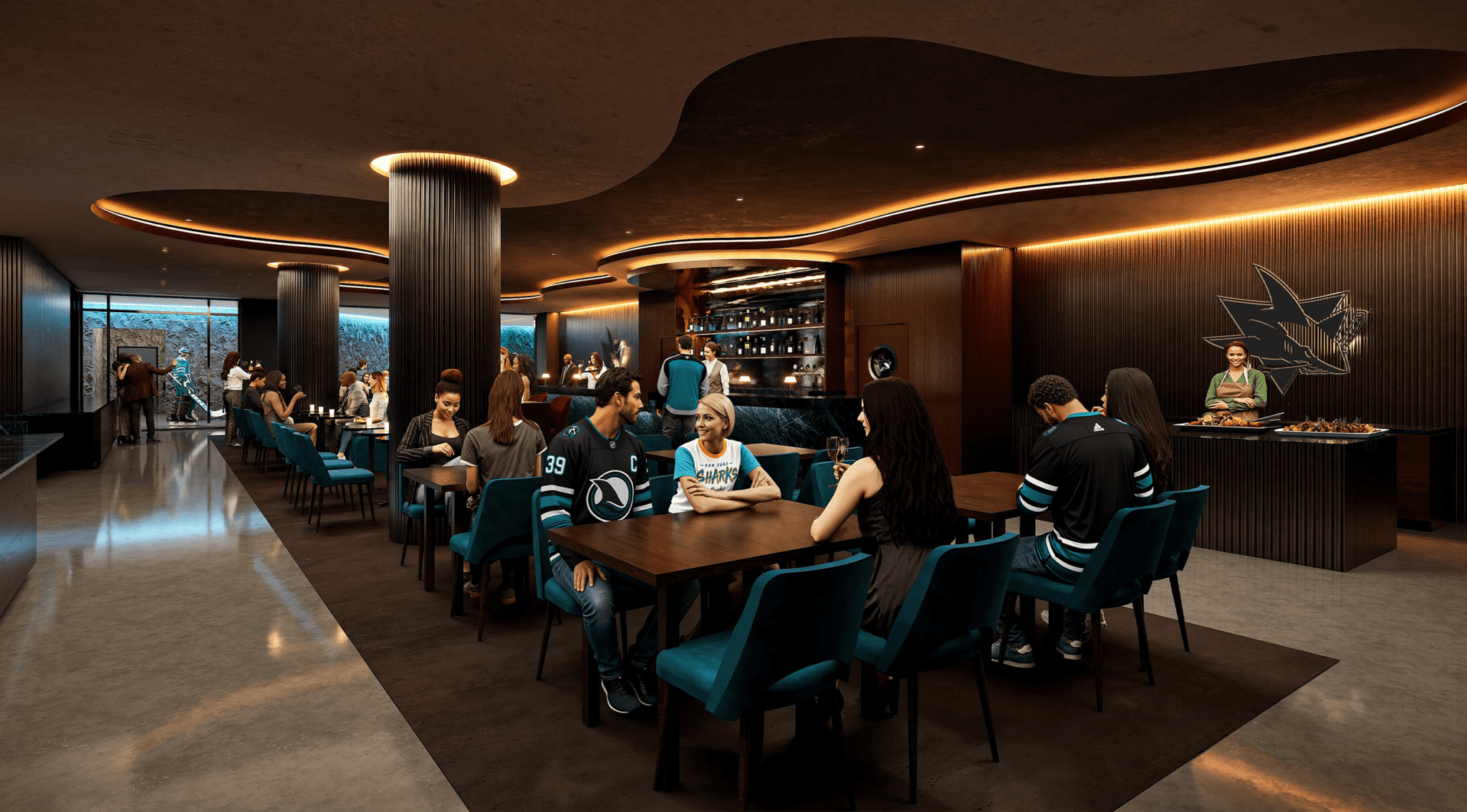 The Legends Level will include spaces for Sharks fans to watch the team walk out from the locker room to the ice, like the Captain’s Lounge – positioned between the Sharks and the visiting team’s locker rooms and rendered below.