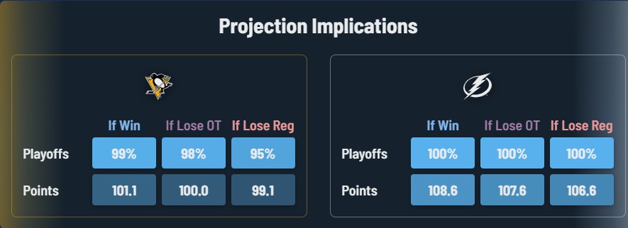 A lot of models from HockeyStats to TheAthletic have the Islanders, Blue Jackets and Flyers all headed for the 95-96 point range. That makes today almost like a house money situation for the Penguins, who should still be on track to easily clear that regardless of today’s results. For as crucial as the games against NYI and Detroit were earlier, the stress is eased for now on the Penguins with where they’re at in the standings and projected to go.
