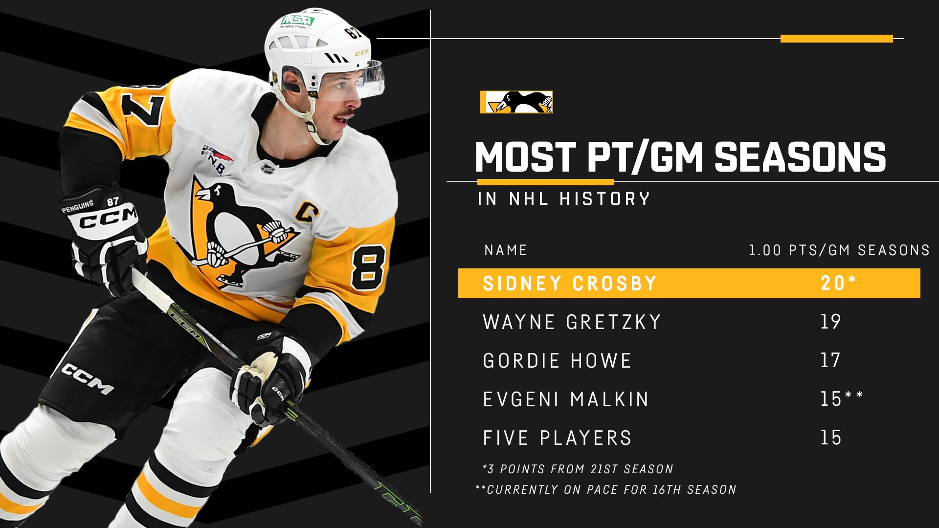 Crosby needs three more points to clinch a 21st consecutive season of a point/game and extend his own NHL record.