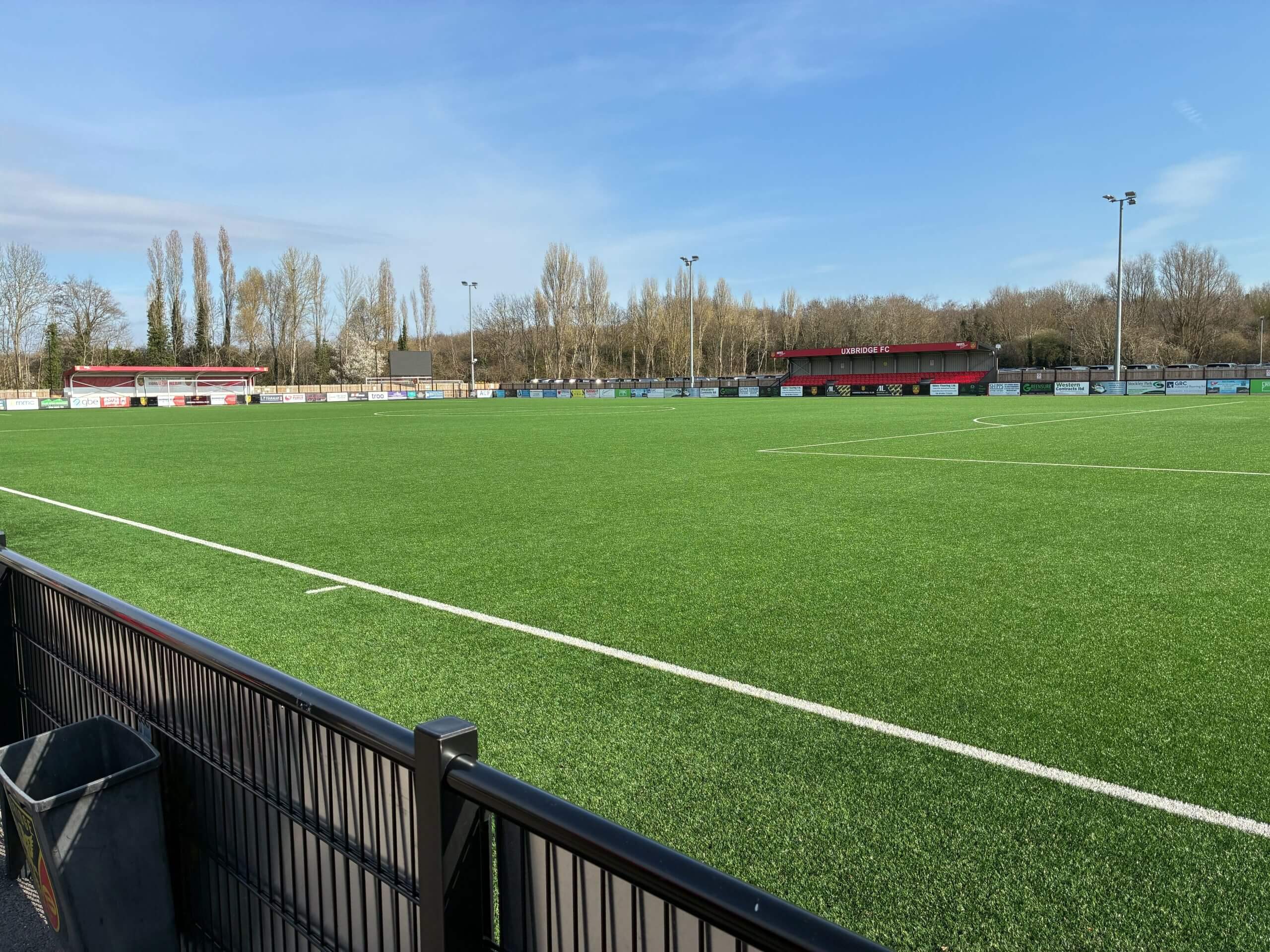 Nestled in the middle of a large green pocket of Yiewsley between a golf course and Stockley Country Park, the 3,770-capacity stadium is flanked on two sides by tall trees and well set back from the nearest road. It also boasts a playing surface far beyond what you would expect from Uxbridge FC’s step 3 status in the national league system: the same state-of-the-art 3G pitch that Swiss club Young Boys play on at Wankdorf Stadium, fitted in late 2024 as part of a £1million refurbishment of the facilities.
