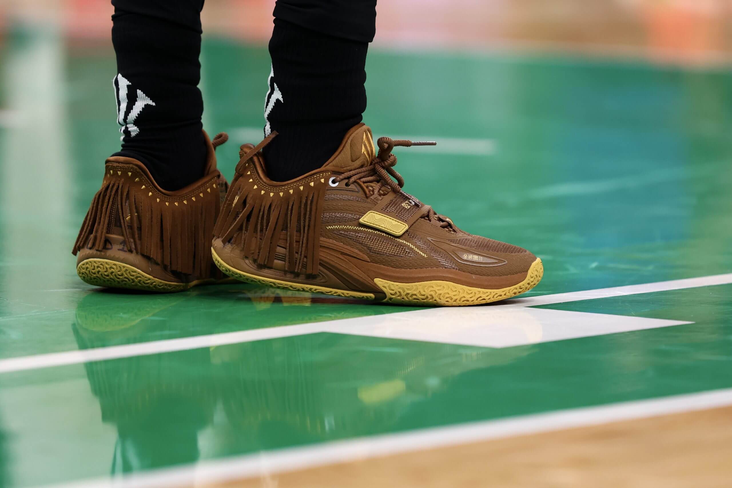 The Anta KAI 1 Chief Hélà shoe worn by its namesake Kyrie Irving in 2024. (Maddie Meyer / Getty Images)