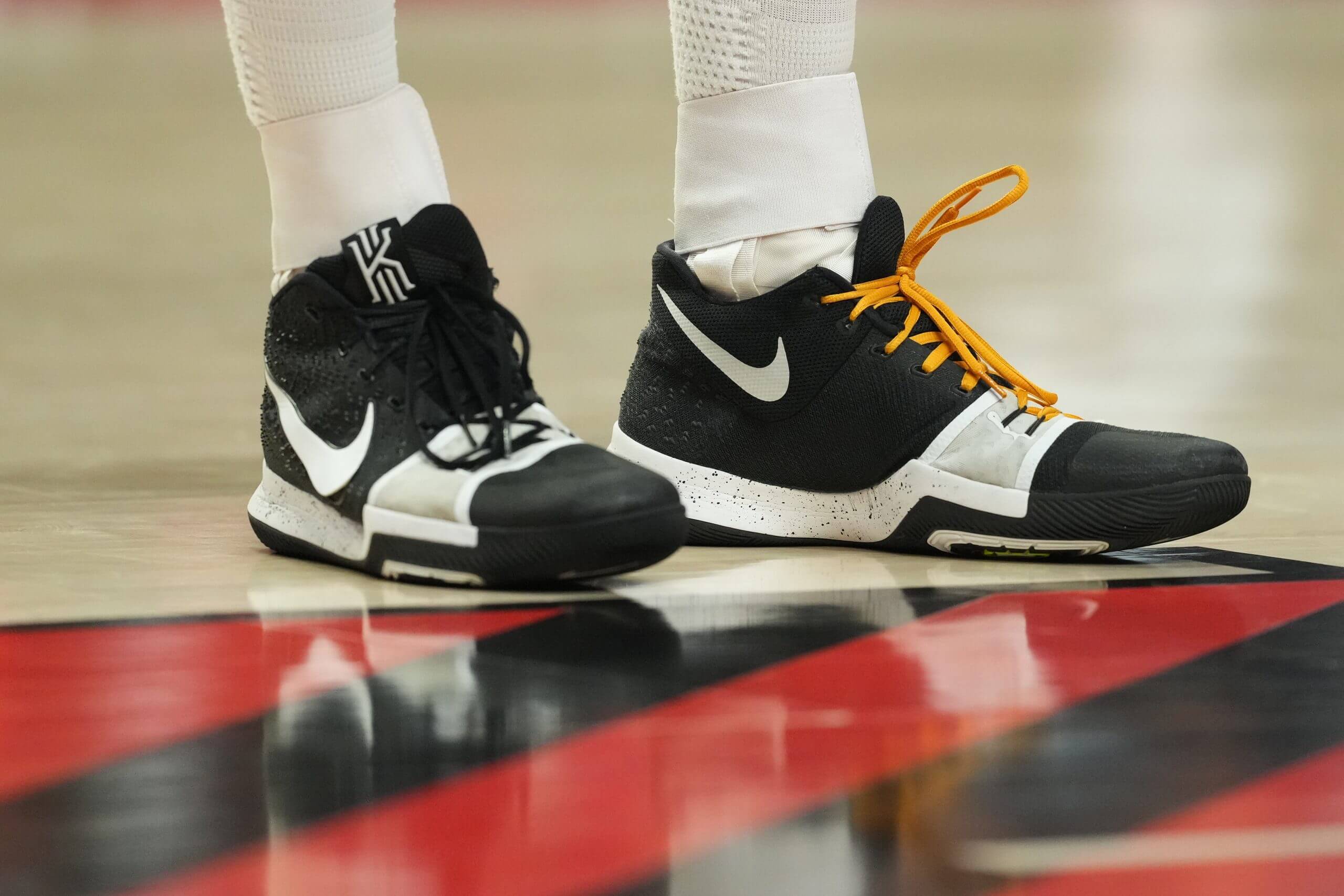 Jarrett Allen, wearing his Nike Kyrie 3 TB Black White shoes during a game in Portland. (Soobum Im / Getty Images)