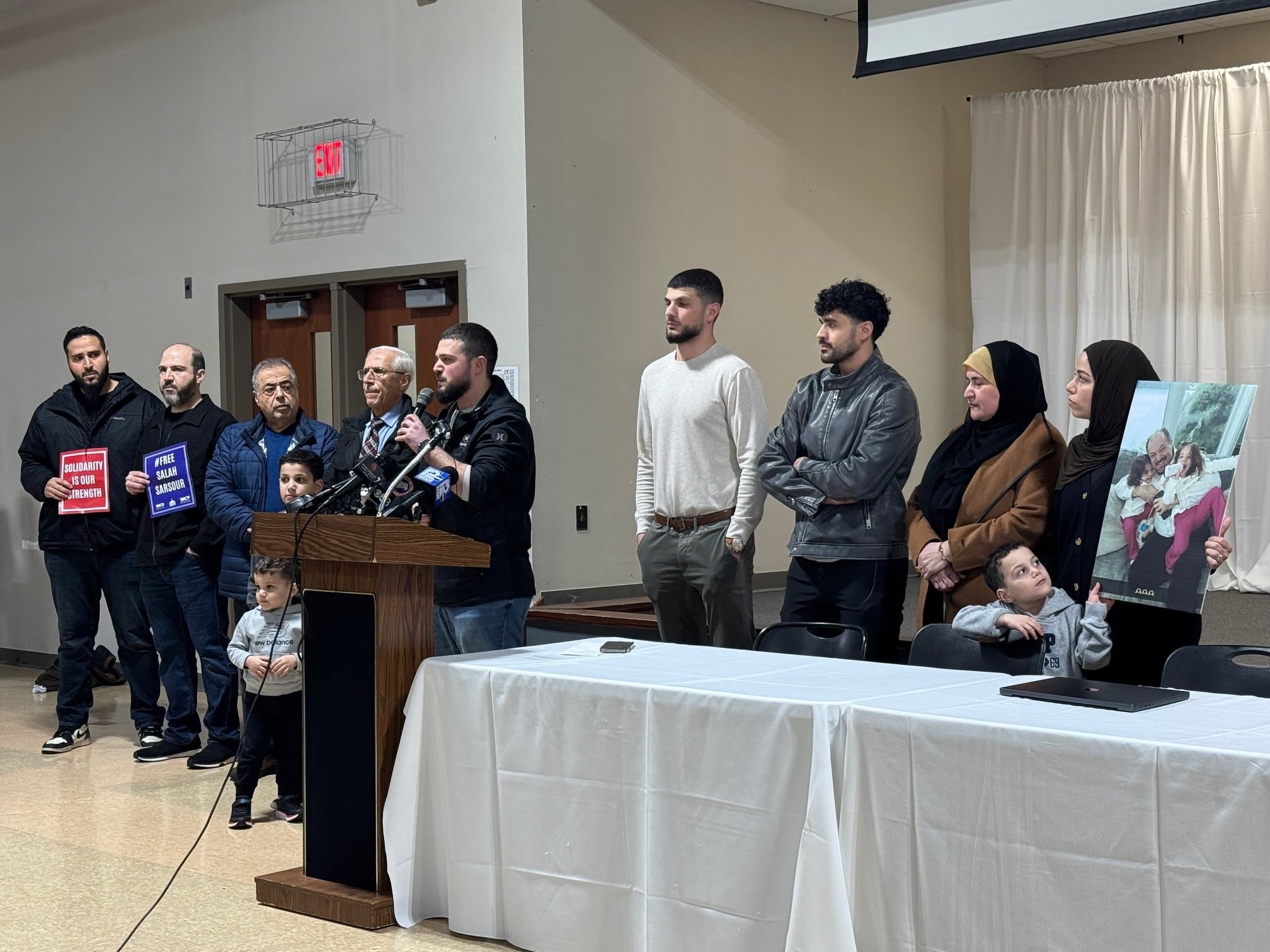 Salah Sarsour’s family gathers during a rally about his federal immigration detention, April 2, 2026. (USA Today Network via Reuters Connect)