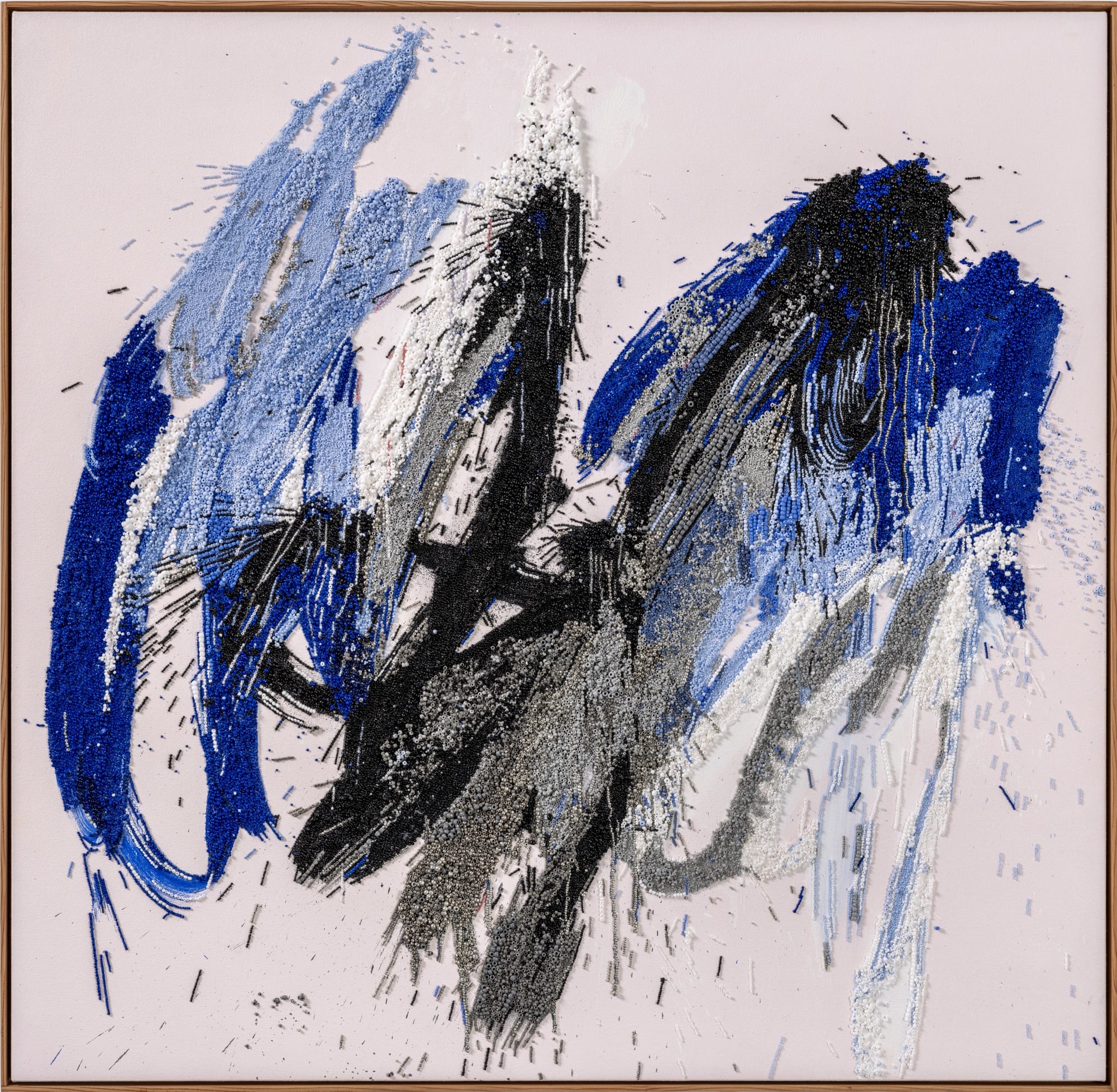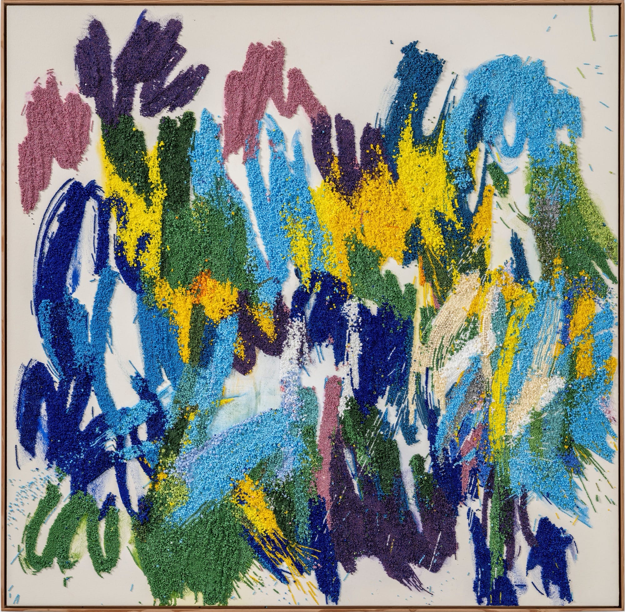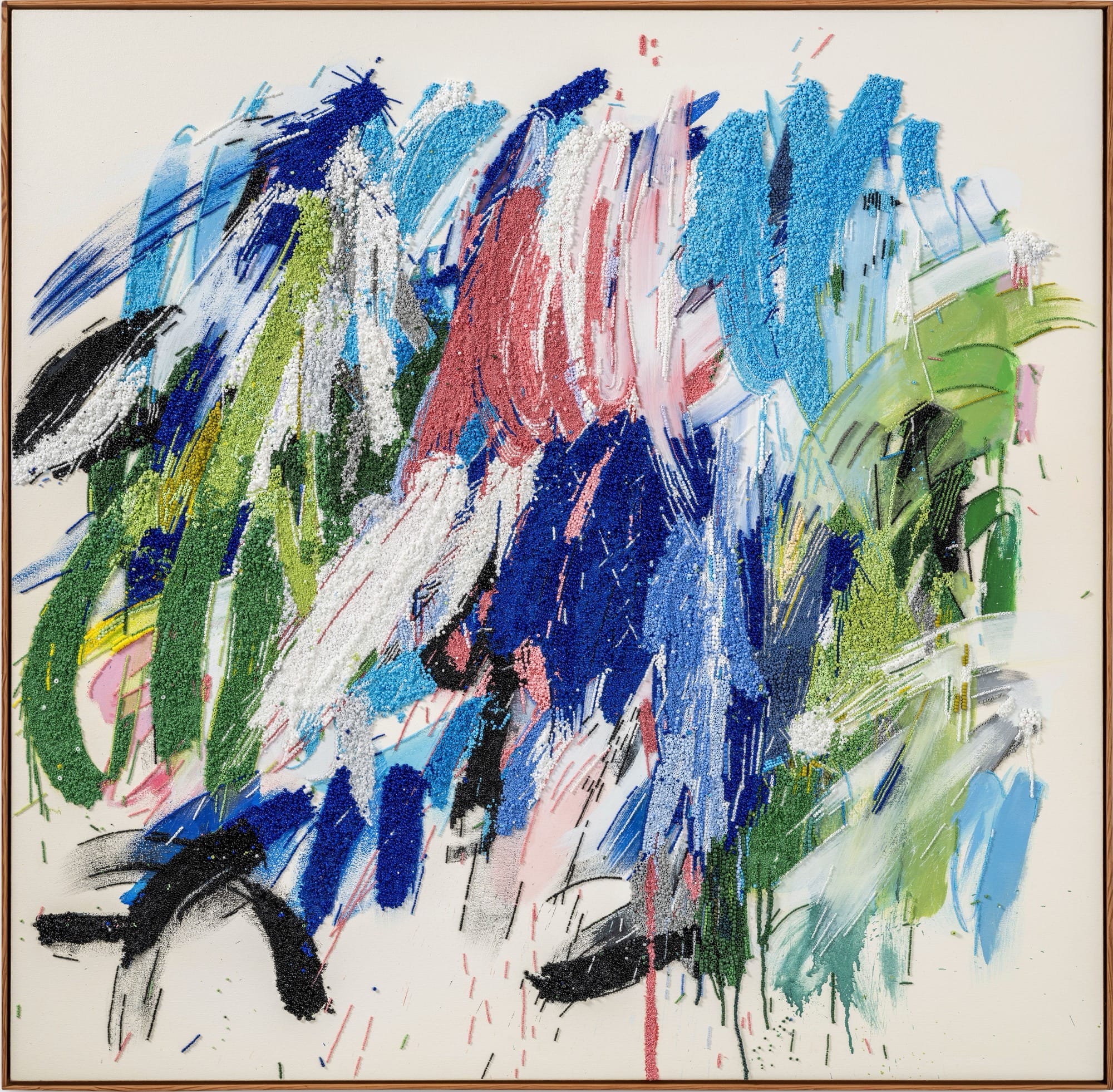 Unlike a quick swipe of a brush, each bead is meticulously placed amid a field of others, creating a chromatic topography. Lou likens them to painting “straight-out-of-the-tube,” except that they can’t be mixed on the canvas. She relies on color relationships, textures, and precise placement to give the impression that, from a distance, the loose strokes and splatters have blended or merged. When viewed up close, we see distinct, saturated topographies that, in a rather macro sense, are delightfully sculptural with the soft ground of painted details underneath. “My process involves this improv where every stroke requires everything I have, my full attention,” Lou says. “Every mark becomes this kind of violin-crescendo-holy shit-experience.”
