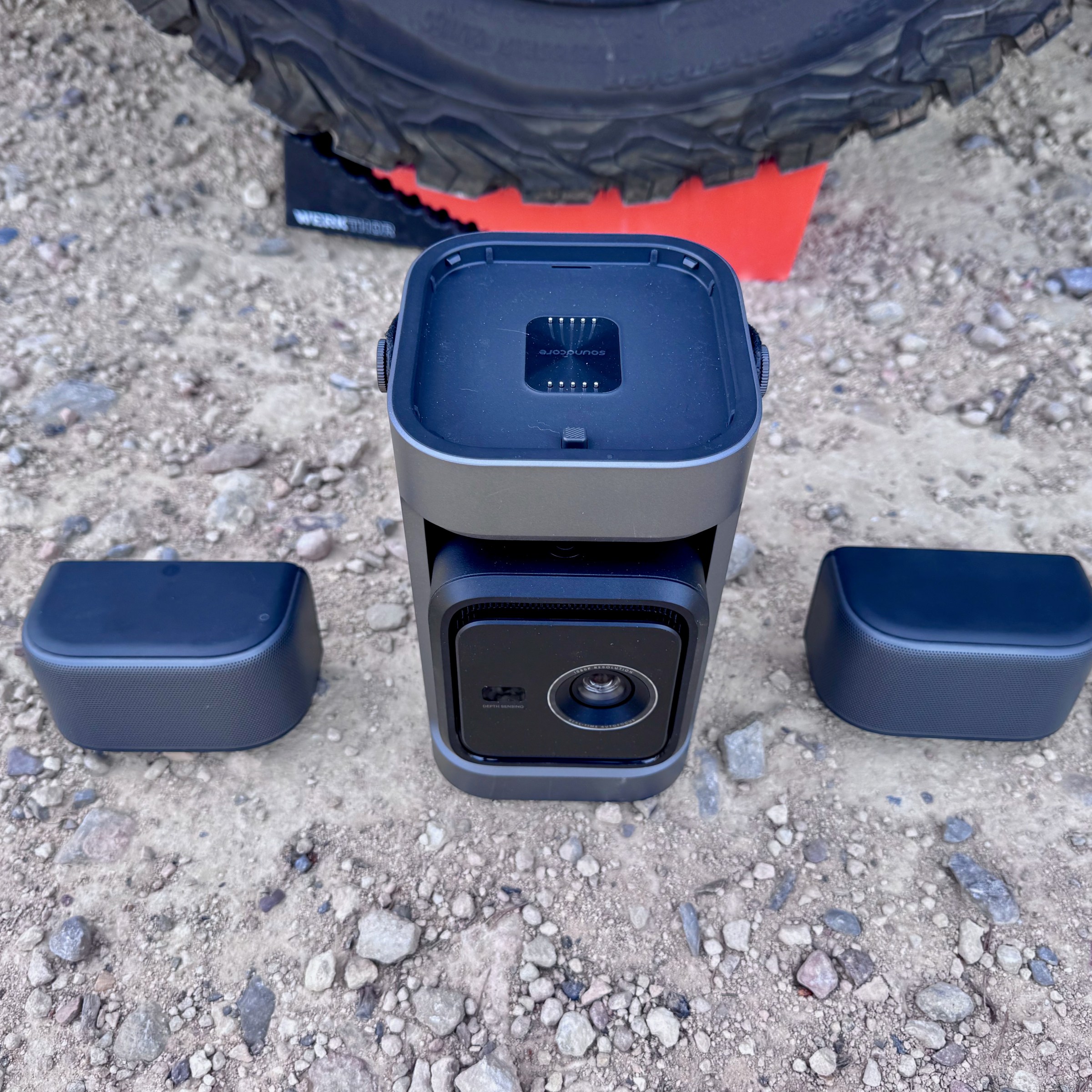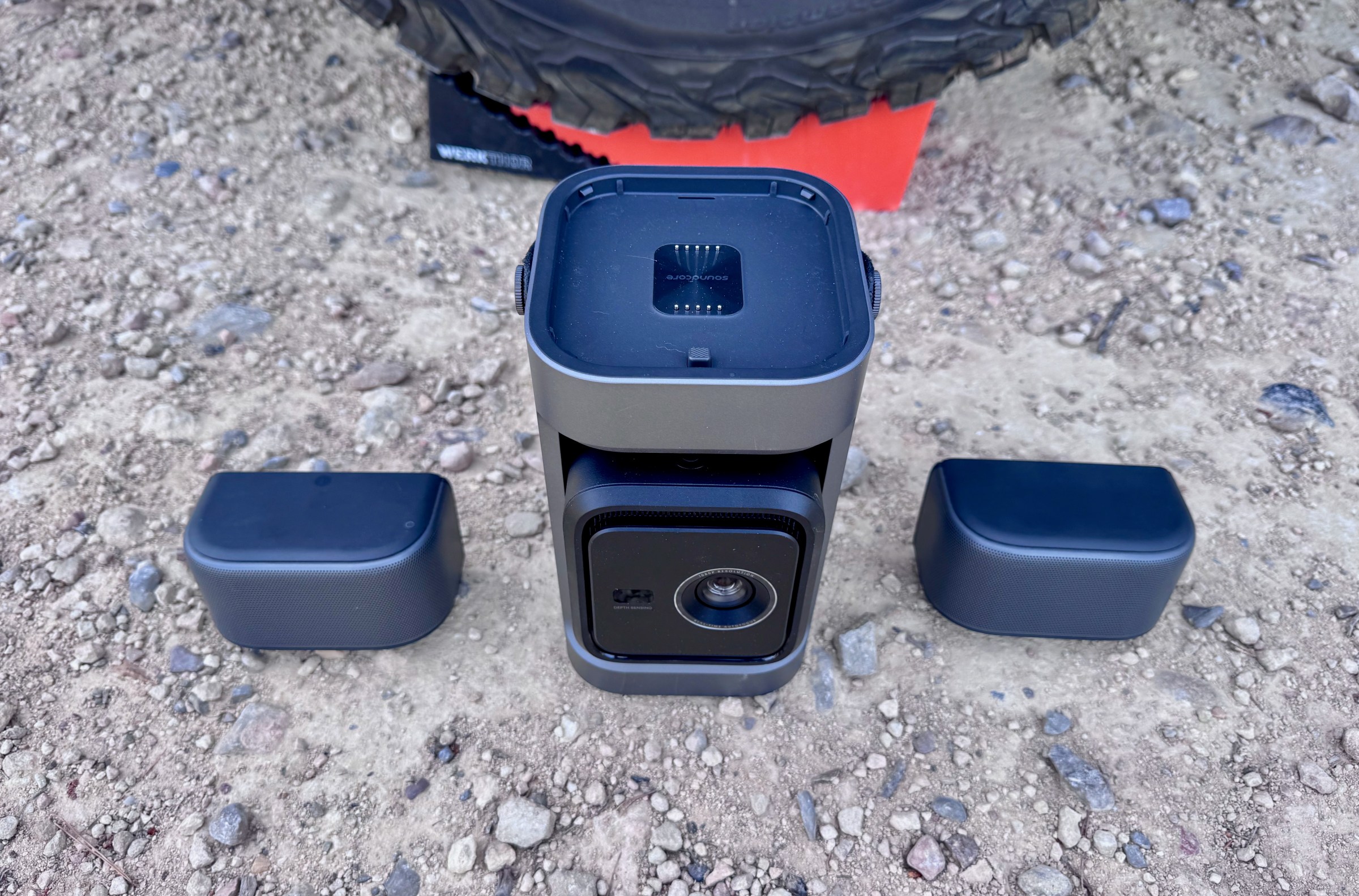 The detachable 10W speakers combine to produce a wide and pleasant soundscape. I’ve grown quite fond of the little speaker pair in my few weeks of testing. As a bonus, they magnetically attach to my van on either side of my projection screen for a clean outdoor movie setup. Putting the speakers up by the display really does help create a more immersive experience. Usually, you’re seated right next to the speakers integrated into portable projectors, which means the audio sounds like it’s coming from the side or your knees instead of where the action is taking place.