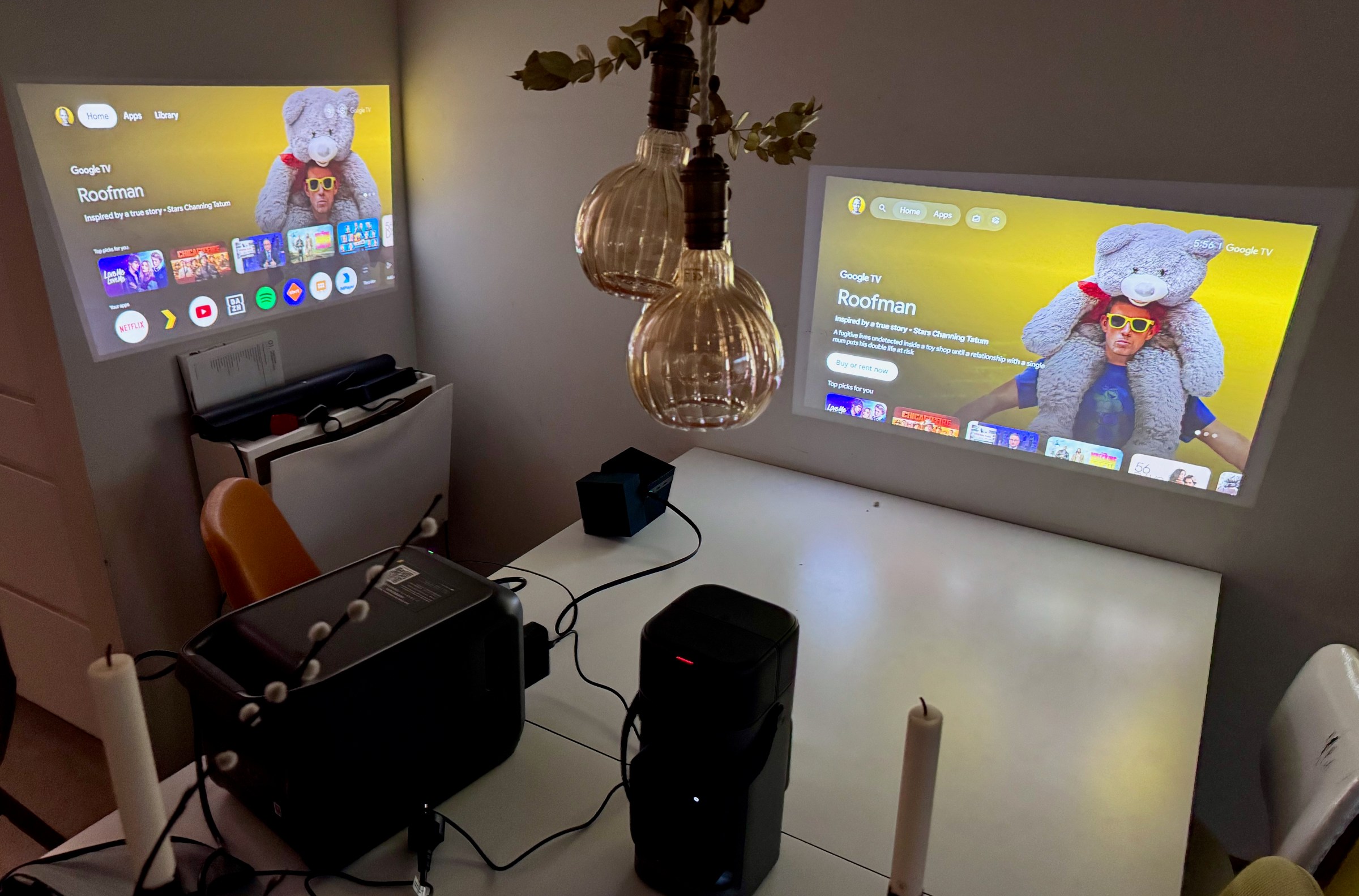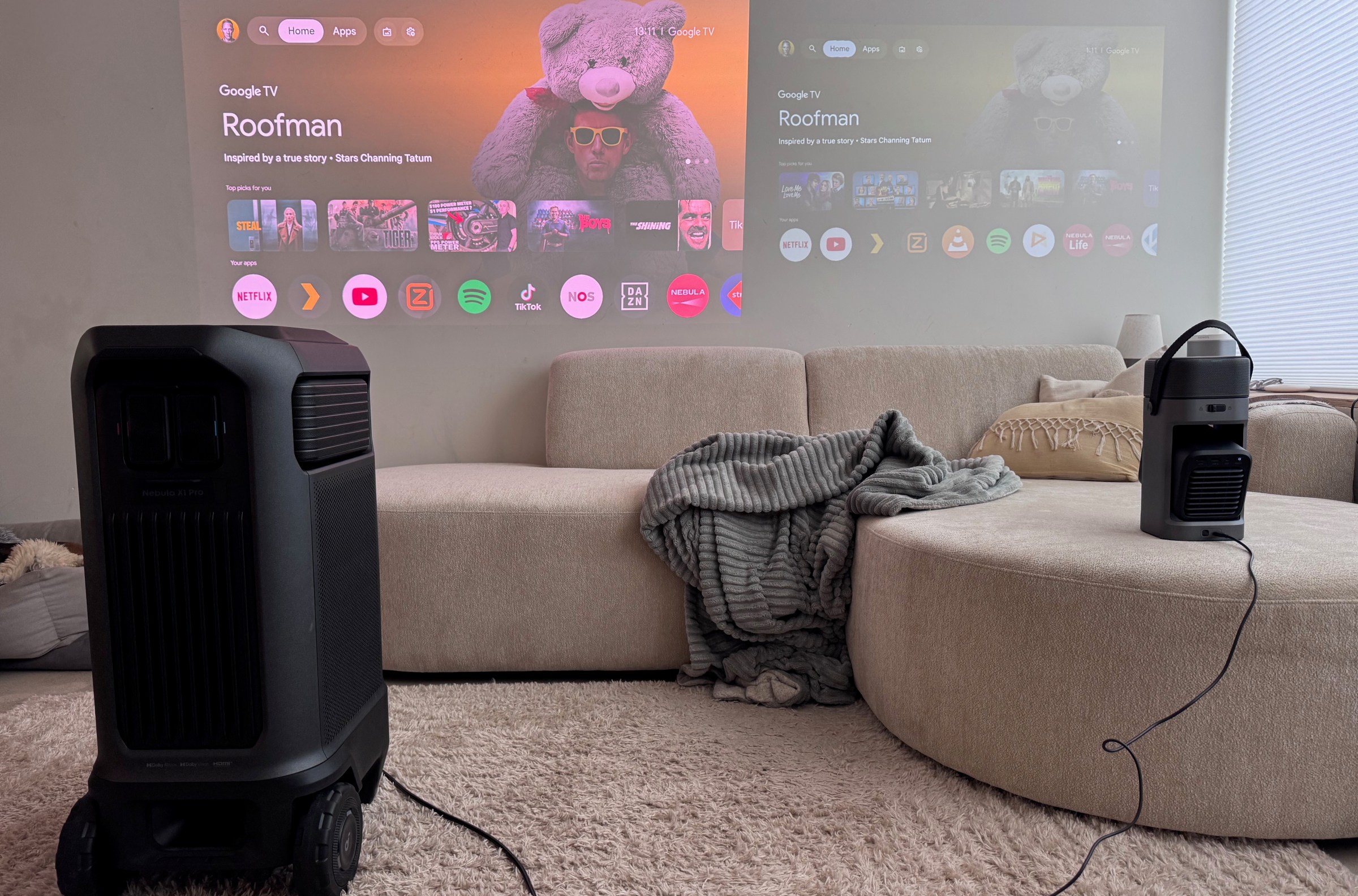 Anker’s 400W, 3500 ANSI lumen Nebula X1 Pro (left) vs. the 20W, 650 ANSI Lumen Nebula P1 (right) during the day.