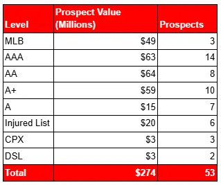 FanGraphs has a unique process of ranking farm systems in which they tie a specific dollar value to each prospect based on grade and position (pitcher vs. batter). I was curious how the talent distribution looks across levels now that all of the minor league rosters are set. In the table below, you can see the aggregate amount of prospect value and total prospects by level.