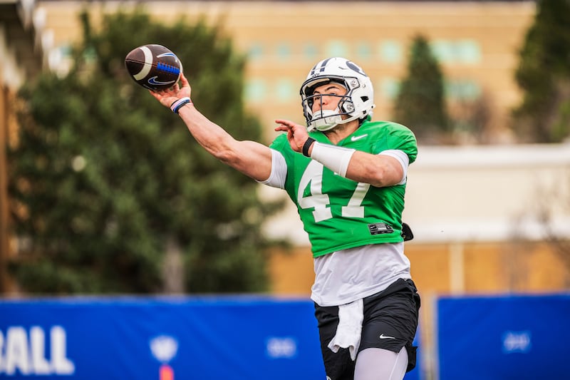 BYU quarterback Bear Bachmeier delivers a pass during spring camp on March 10, 2026, in Provo. | Nate Edwards