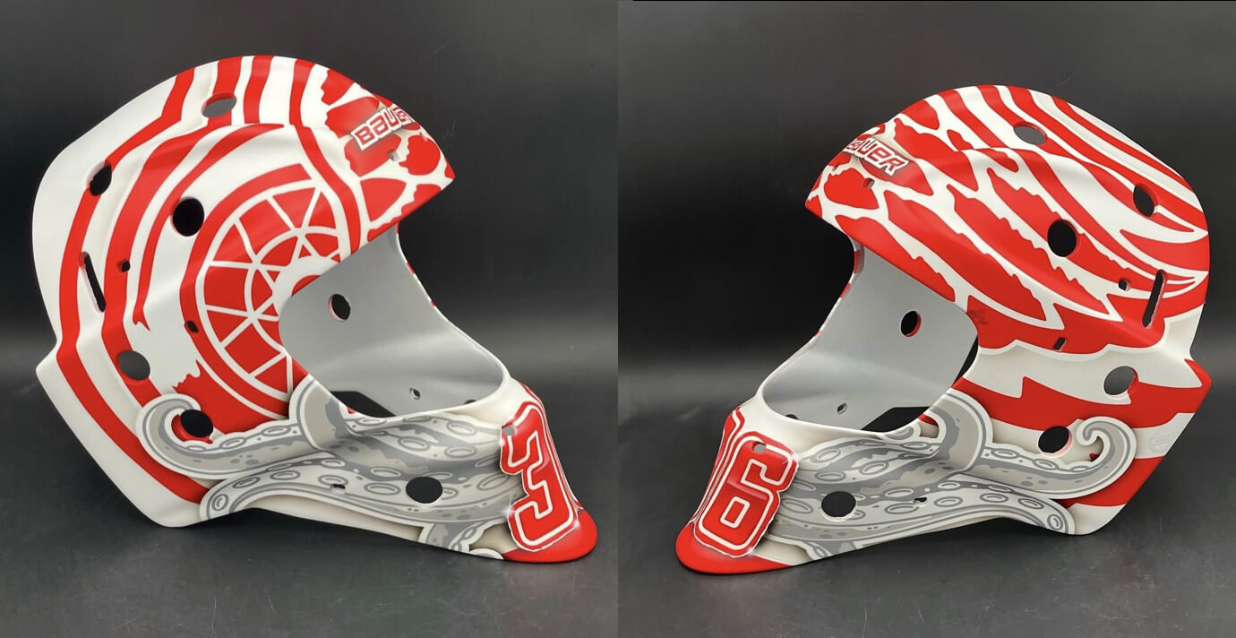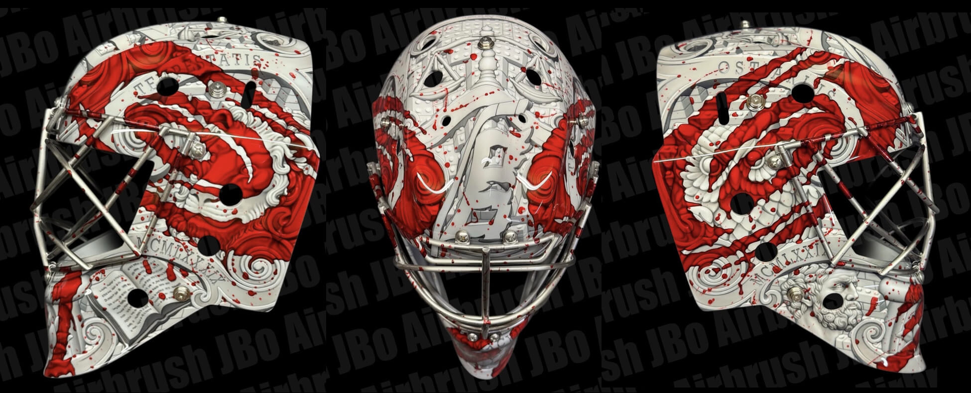 Goldman: Simple perfection. It just feels incredibly fitting for the Red Wings’ centennial season: the basic red-and-white colorway, the focus on the intricacies of Detroit’s logo from a zoomed-in perspective, the nod to an iconic tradition with the octopus detailing, and the matte finish. It’s pretty similar to Gibson’s actual centennial mask, which uses cream instead of white for that throwback feel.