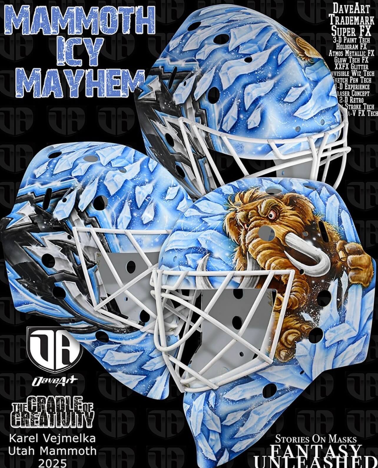 Goldman: As much as I love the Mammoth’s logo and full kits this year, I kind of wish the team leaned in more with the “mountain blue” a little to differentiate this team’s color scheme more. Vejmelka’s mask uses it so well and it’s the perfect complement to Utah’s home and away sweaters. The design itself is pretty simple but also really sharp. It looks great head-on, and from either angle with the Mammoth detail and logo.