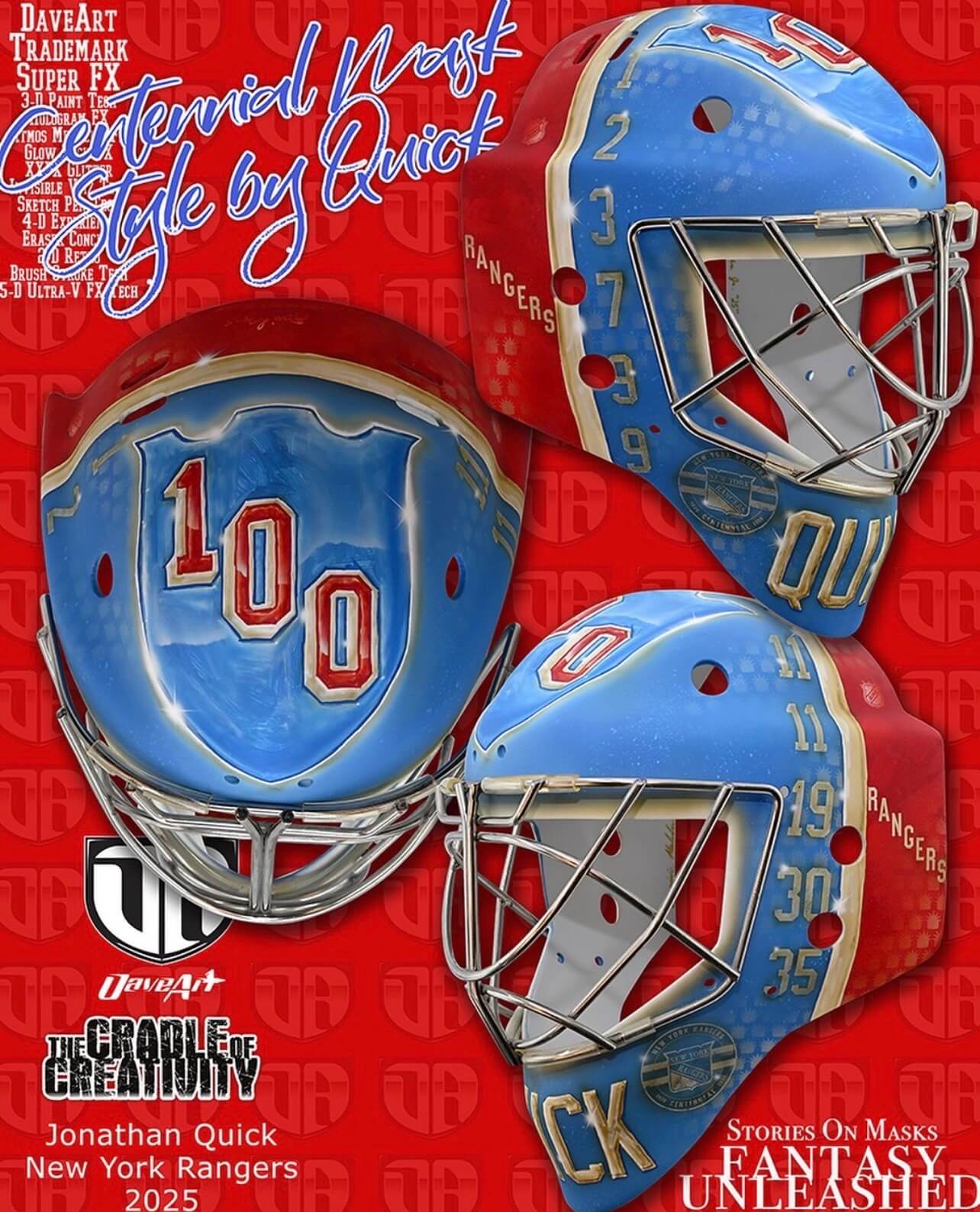 Jesse Granger: In an exceptionally strong year, Quick’s centennial design comes in last, but it’s still a good-looking mask. The colors match New York’s 100th-year anniversary jerseys well and create a throwback look along with Quick’s vintage Vaughn pads. The retired numbers along the sides are also a nice touch.