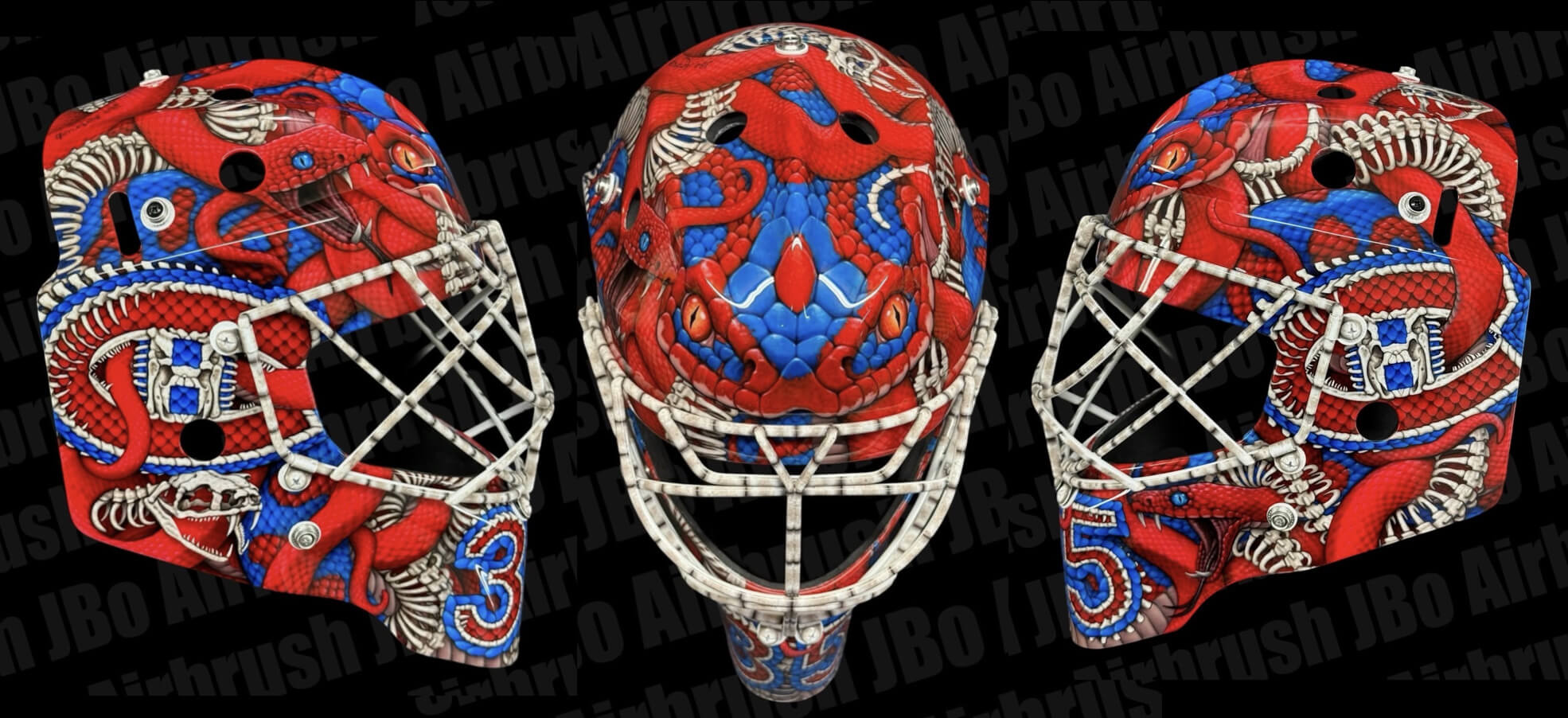 Goldman: It’s bright. It’s interesting. It’s incredibly detailed. And it fully commits to the theme. Everything about this mask rocks. The snake-patterned Canadiens’ logo and No.35 is fantastic, and the cage is absolutely sick.
