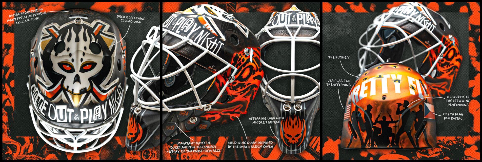 Granger: This mask was designed by Dostal and Offspring guitarist Kevin “Noodles” Wasserman for Anaheim’s themed “Come Out & Play Night” on Feb. 3, and they did some really nice work. Dostal always wanted a mask with a skull, and the Offspring logo, combined with a flaming Wild Wing on the side, is pretty fly.