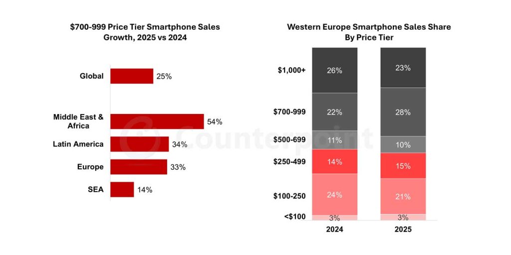 According to Counterpoint, those devices have seen a recent surge in popularity across regions such as the Middle East, Africa, Latin America, and Europe. Users are looking for phones that offer reliable, fast performance without the hyped up features that don’t matter in the long run. Those regions saw an increase in sales to such devices by as much as 54%.
