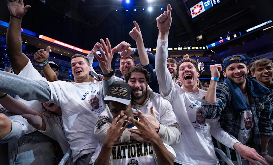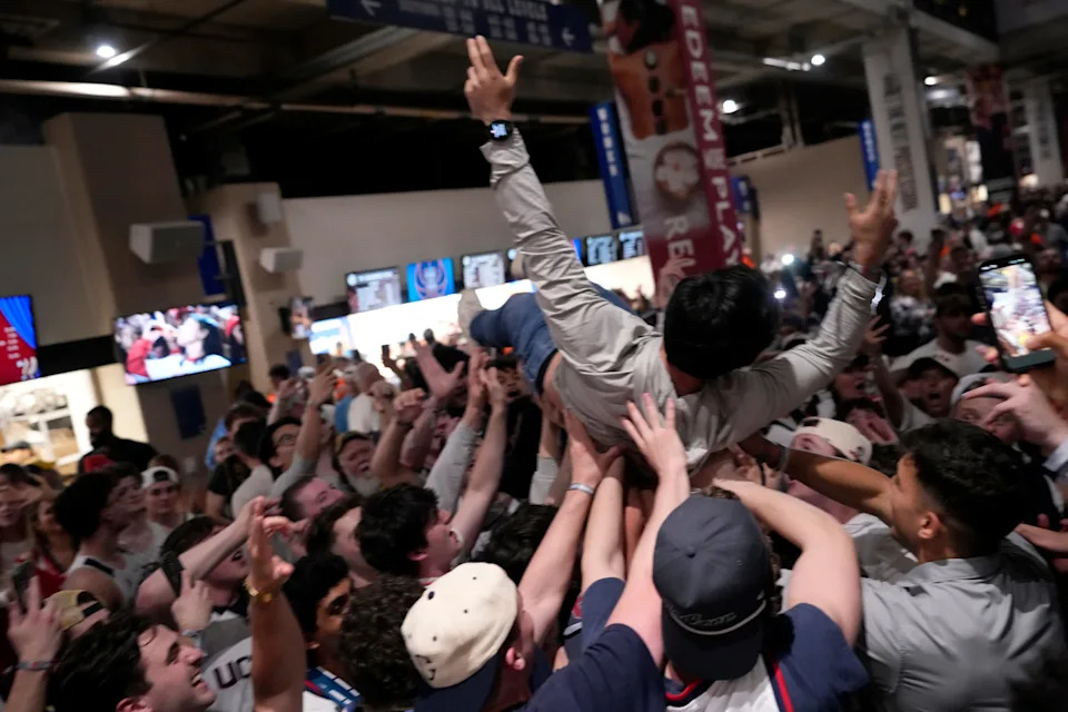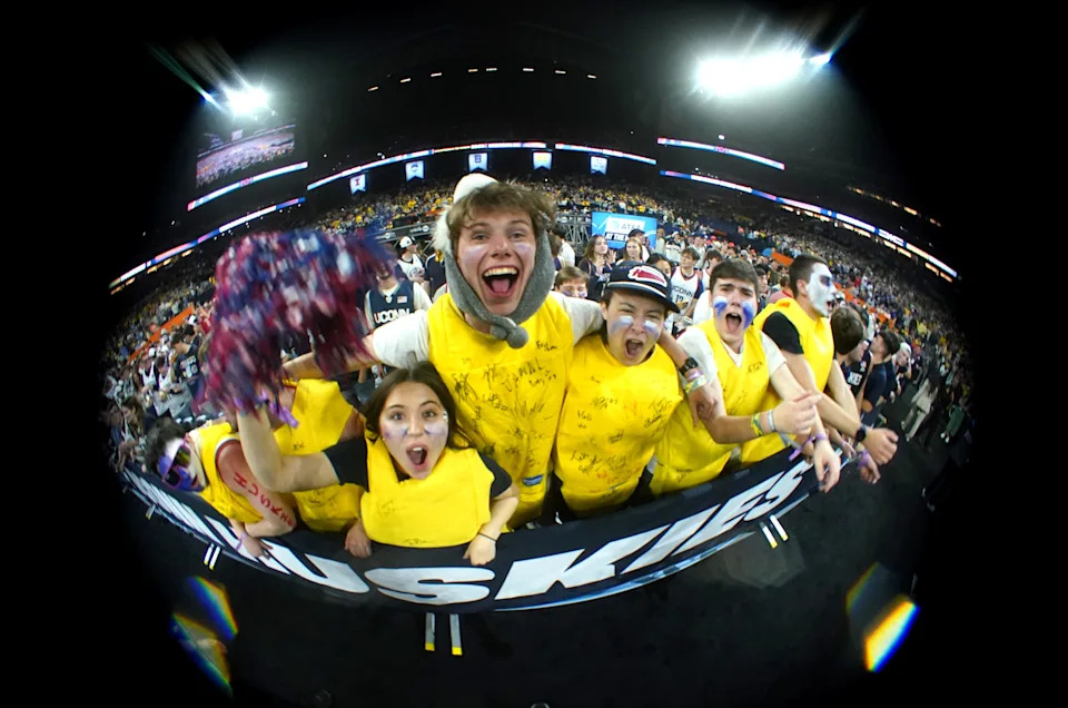 UConn Huskies fans celebrate their Final Four victory Saturday, April 4, 2026, after defeating the Illinois Fighting Illini 71-62 at Lucas Oil Stadium in Indianapolis.