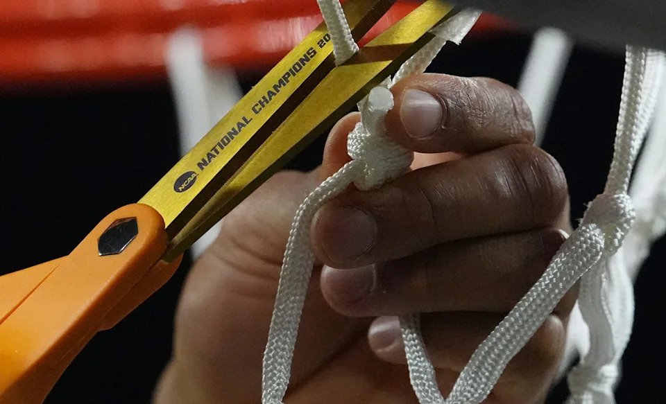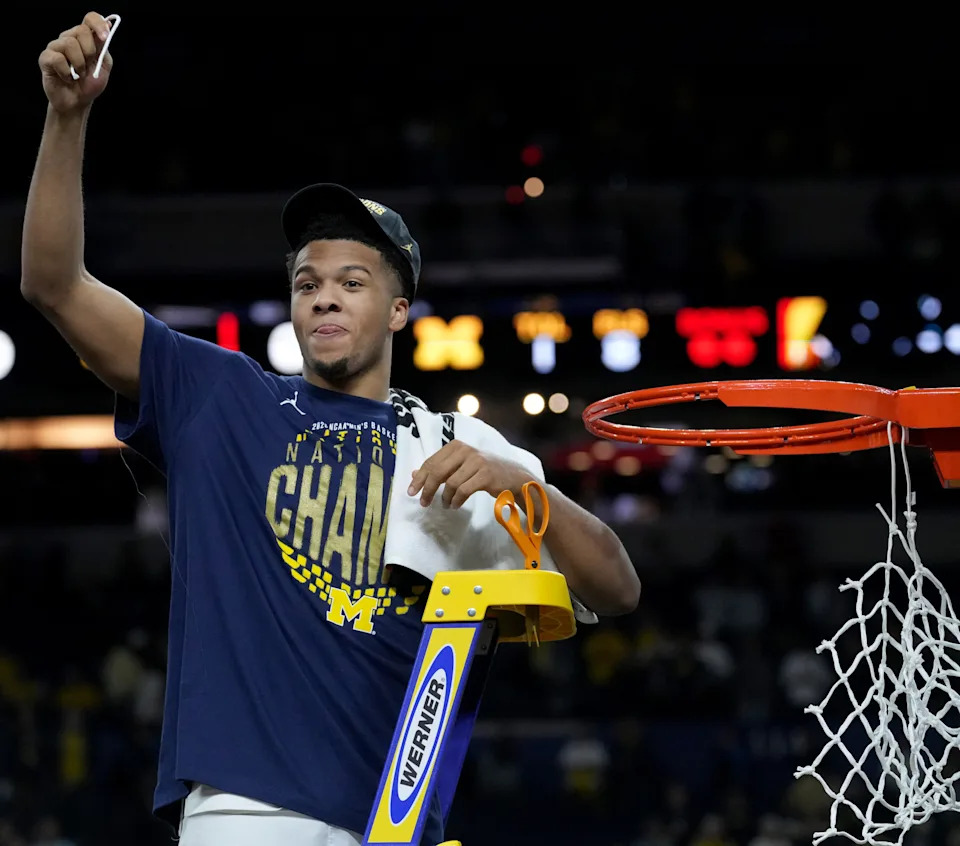 Michigan Wolverines guard Trey McKenney (1) cuts a piece of net Monday, April 6, 2026, while celebrating the team’s NCAA men’s basketball tournament national championship victory over the UConn Huskies 69-63 at Lucas Oil Stadium in Indianapolis.