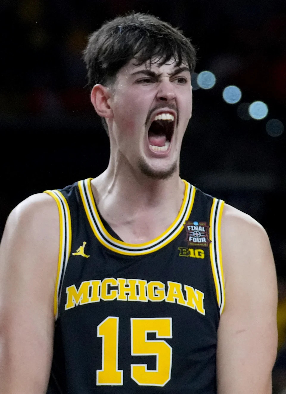 Michigan Wolverines center Aday Mara (15) reacts after a dunk Saturday, April 4, 2026, during a Final Four game against the Arizona Wildcats at Lucas Oil Stadium in Indianapolis.