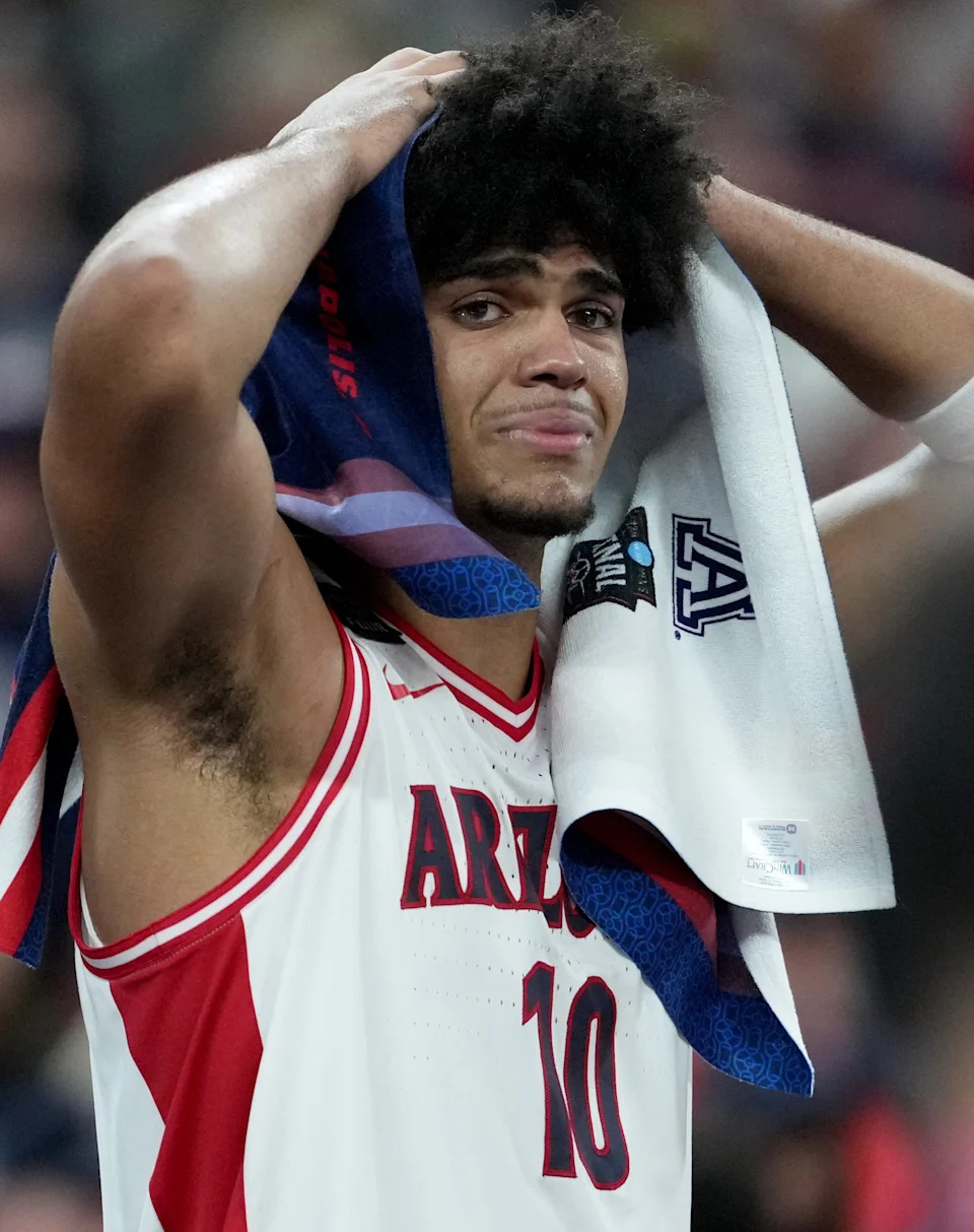Arizona Wildcats forward Koa Peat (10) cries Saturday, April 4, 2026, after the team’s 91-73 loss to the Michigan Wolverines during the Final Four at Lucas Oil Stadium in Indianapolis.