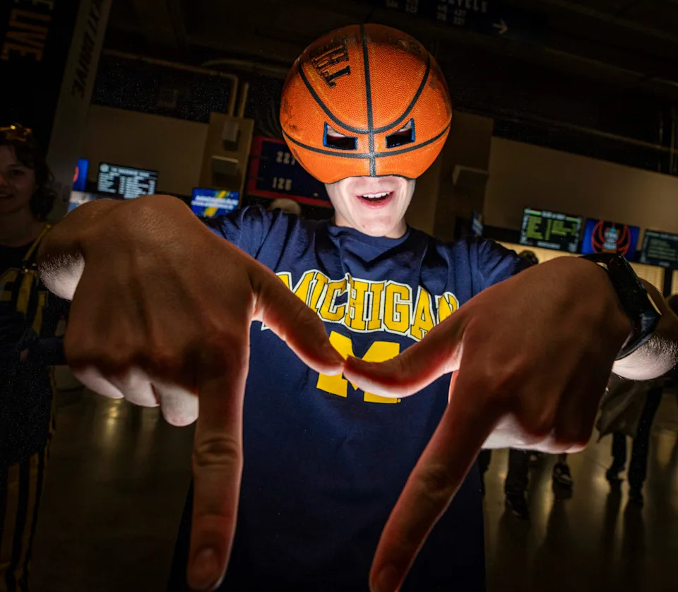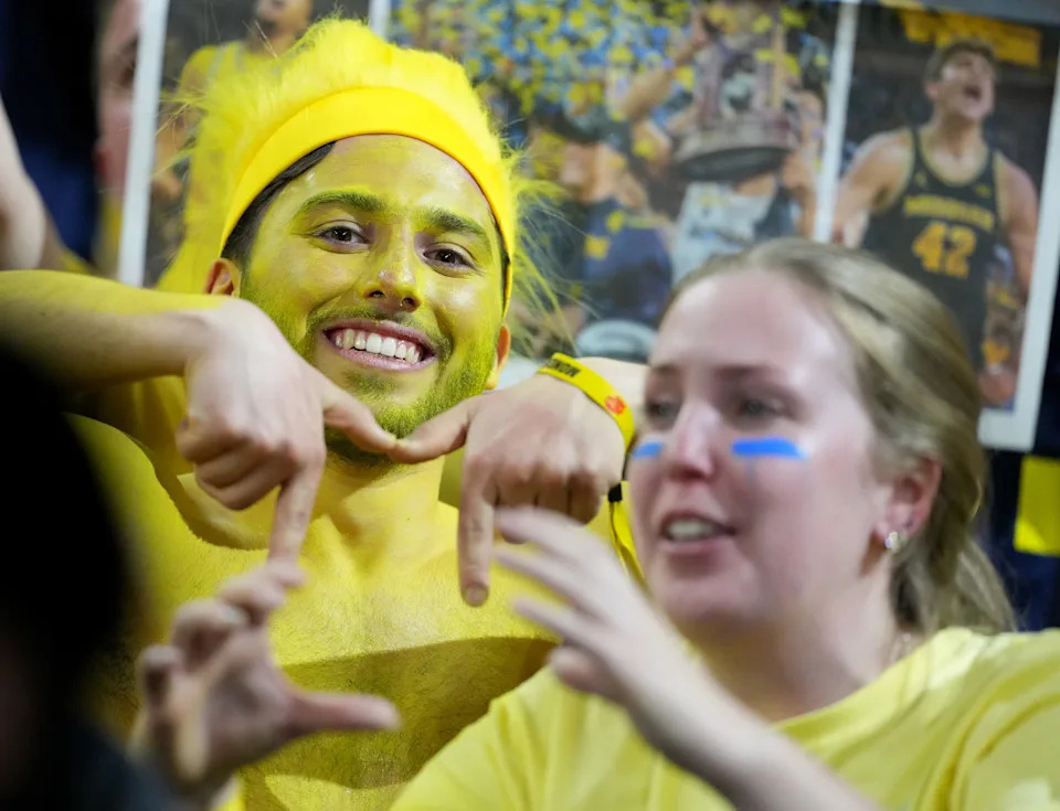 Michigan Wolverines fans cheer Monday, April 6, 2026, ahead of the NCAA men’s basketball tournament national championship game against the UConn Huskies at Lucas Oil Stadium in Indianapolis.
