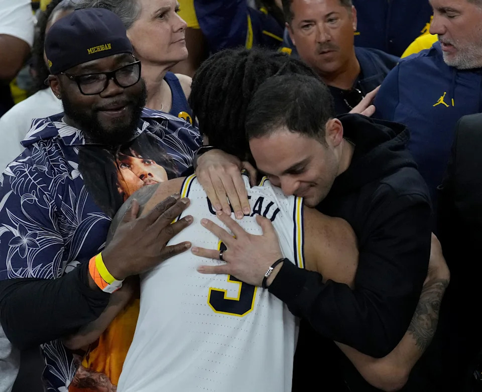 Michigan Wolverines guard Elliot Cadeau (3) gets a hug from people in the stands Monday, April 6, 2026, after defeating the UConn Huskies 69-63 at Lucas Oil Stadium in Indianapolis.