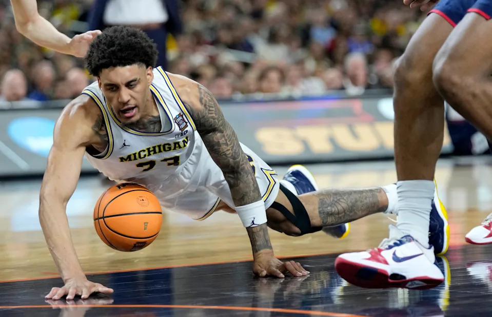 Michigan Wolverines forward Yaxel Lendeborg (23) dives for a loose ball Monday, April 6, 2026, during the NCAA men’s basketball tournament national championship game against the UConn Huskies at Lucas Oil Stadium in Indianapolis.