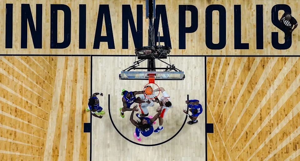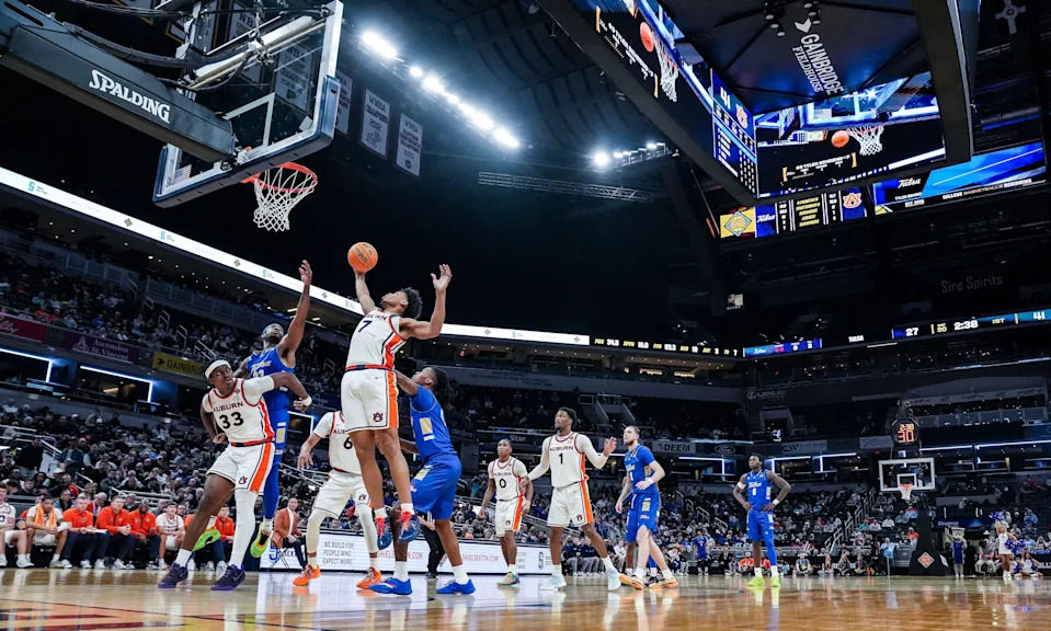 Auburn Tigers compete against Tulsa Golden Hurricane on Sunday, April 5, 2026, during the NIT men’s basketball championship game at Gainbridge Fieldhouse in Indianapolis.
