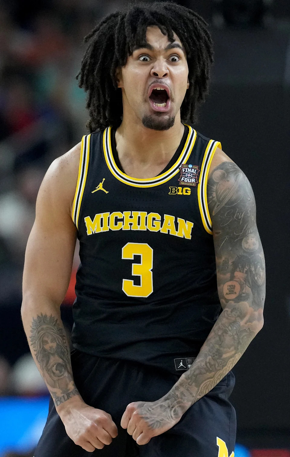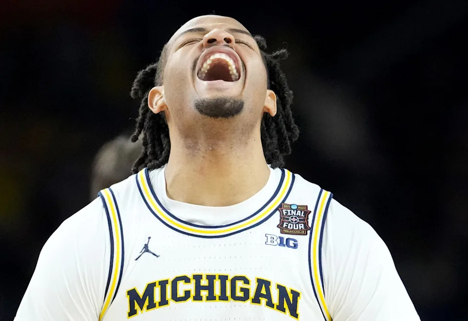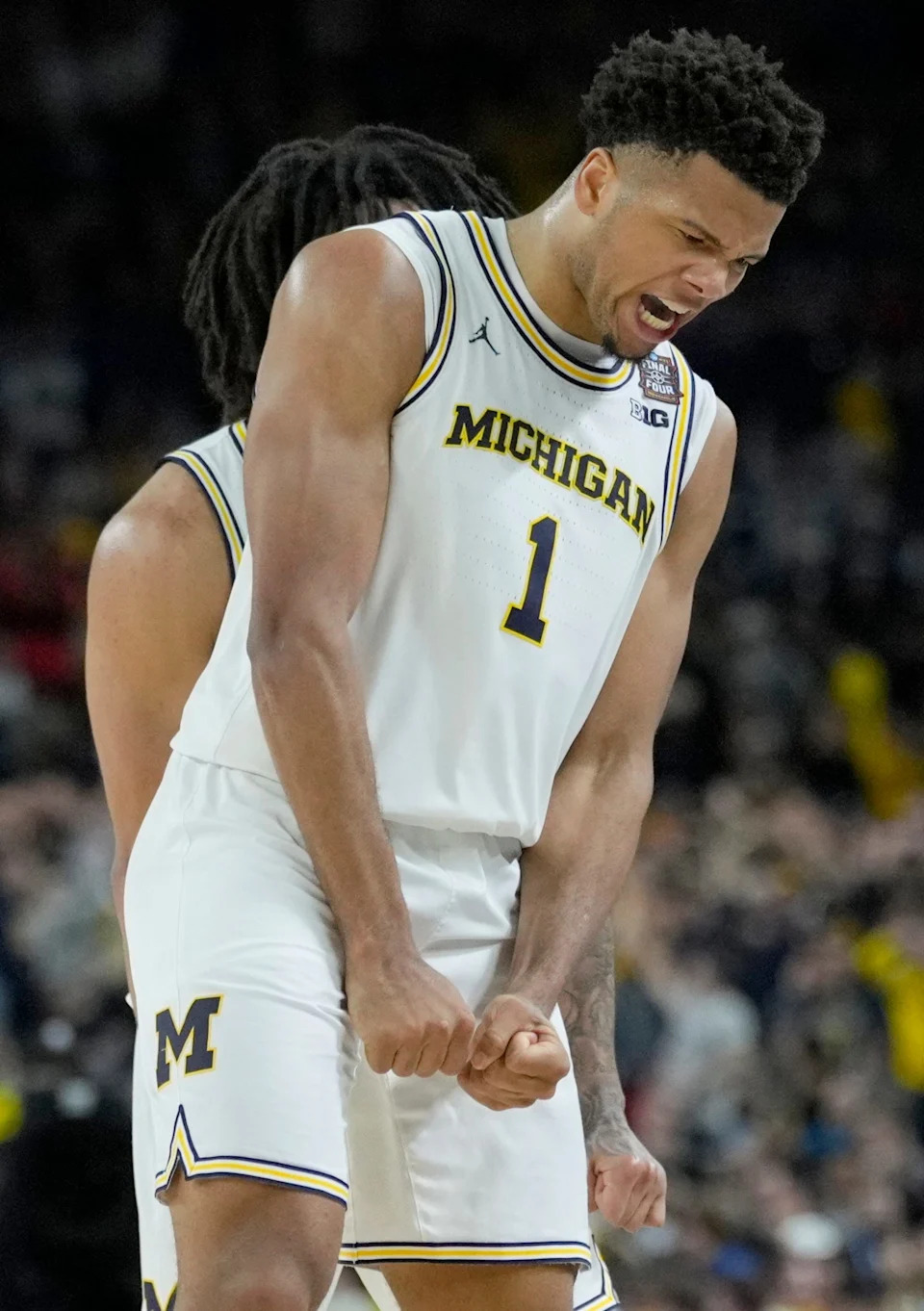 Michigan Wolverines guard Trey McKenney (1) yells Saturday, April 4, 2026, during a Final Four game against the Arizona Wildcats at Lucas Oil Stadium in Indianapolis.