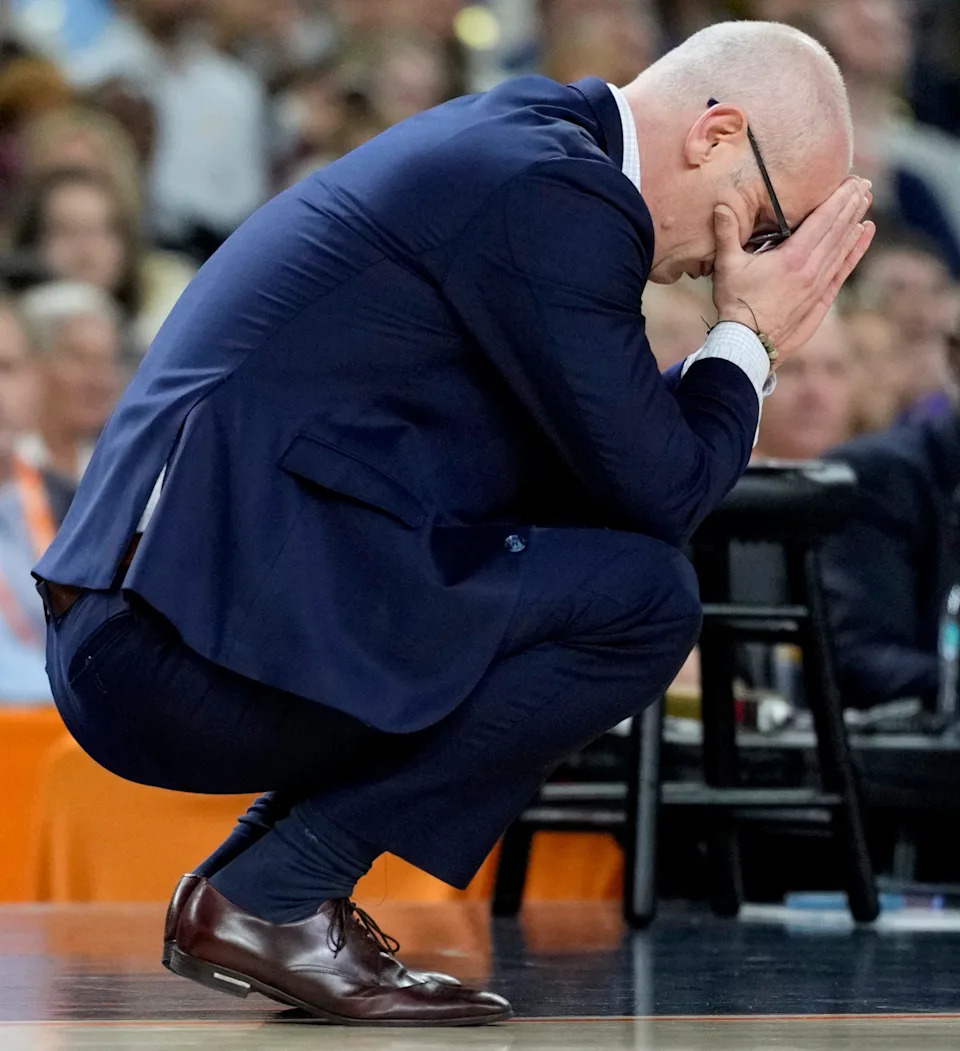 UConn Huskies head coach Dan Hurley reacts on the sideline Monday, April 6, 2026, during the NCAA men’s basketball tournament national championship game against the UConn Huskies at Lucas Oil Stadium in Indianapolis.
