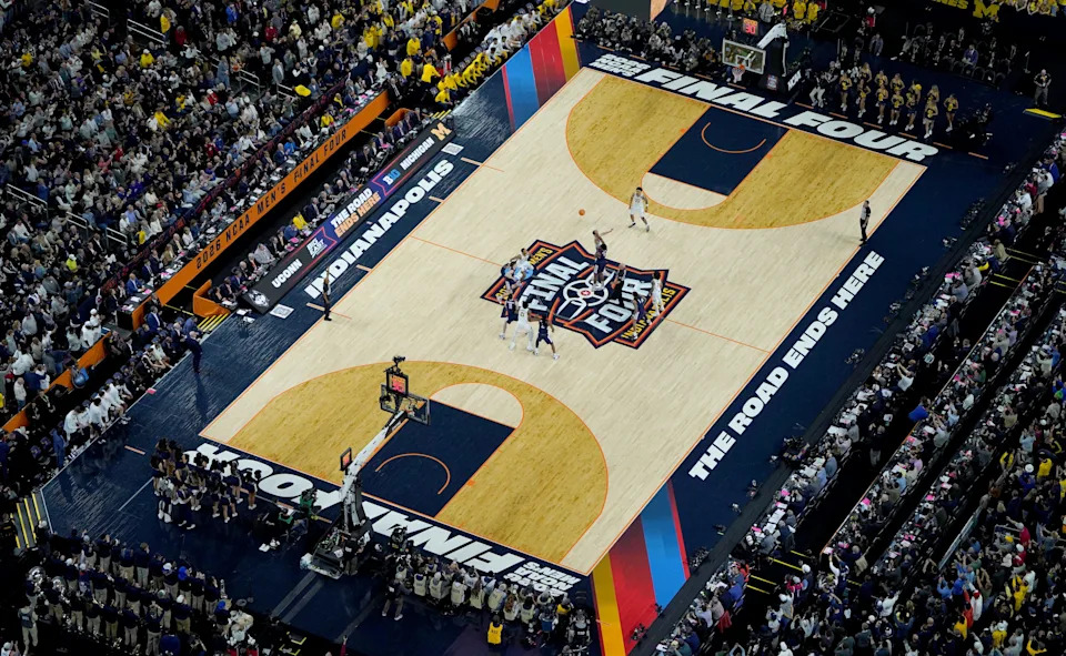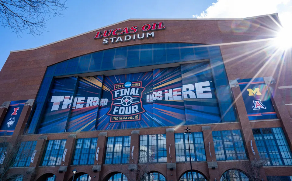 A look at Lucas Oil Stadium on Monday, April 6, 2026, ahead of the NCAA men’s basketball national championship in Indianapolis.