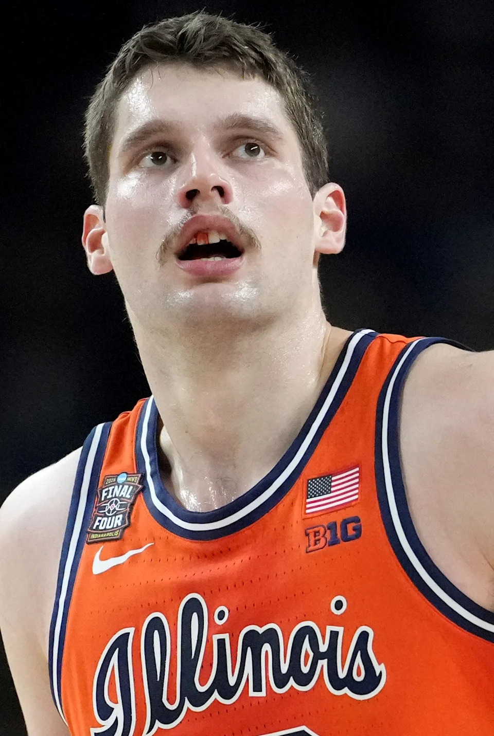 Illinois Fighting Illini center Tomislav Ivisic (13) walks off the court after taking an elbow to the mouth Saturday, April 4, 2026, during a Final Four game against the UConn Huskies at Lucas Oil Stadium in Indianapolis.