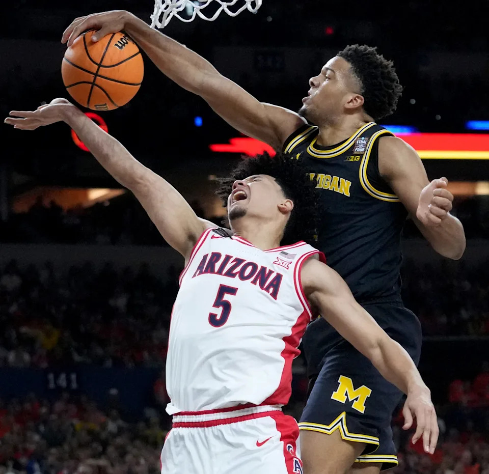 Michigan Wolverines guard Trey McKenney (1) blocks a shot by Arizona Wildcats guard Brayden Burries (5) on Saturday, April 4, 2026, during a Final Four game at Lucas Oil Stadium in Indianapolis.