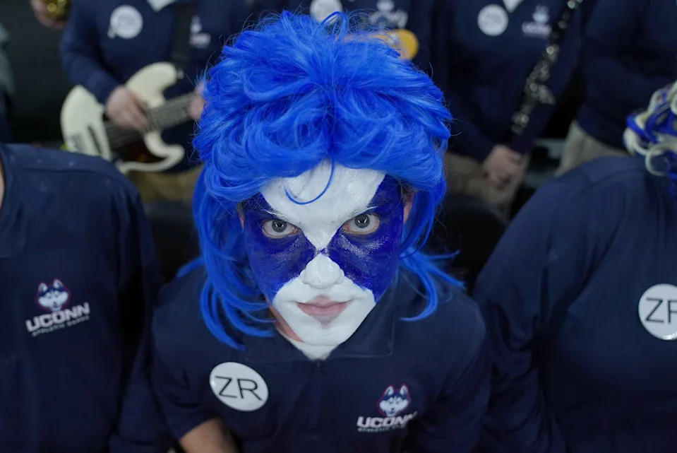 A UConn Huskies band member shows their team spirit Saturday, April 4, 2026, ahead of the team’s Final Four game against the Illinois Fighting Illini at Lucas Oil Stadium in Indianapolis.