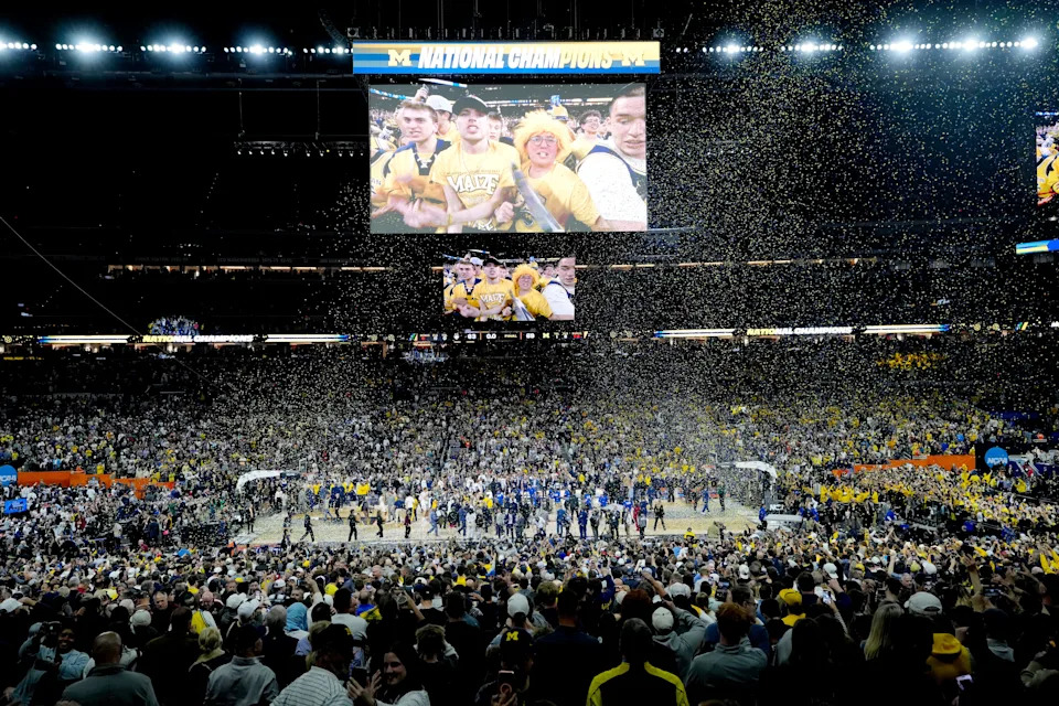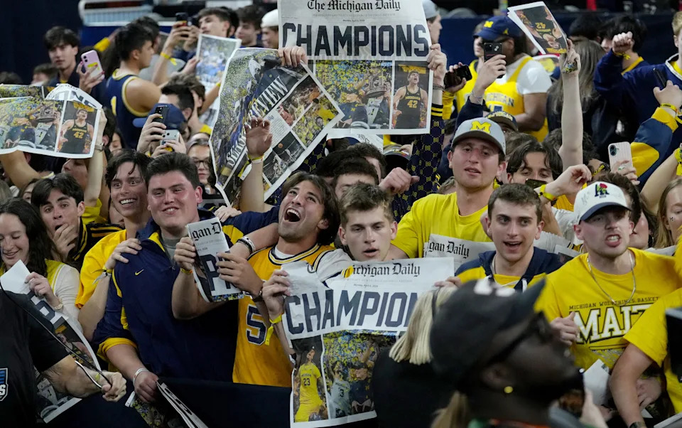 Michigan Wolverines fans celebrate their NCAA men’s basketball tournament national championship victory Monday, April 6, 2026, after defeating the UConn Huskies 69-63 at Lucas Oil Stadium in Indianapolis.