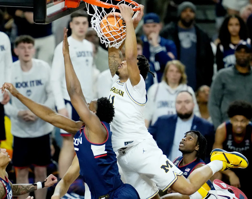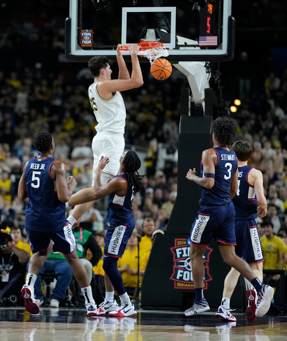 Michigan Wolverines center Aday Mara (15) dunks Monday, April 6, 2026, against the UConn Huskies during the NCAA men’s basketball tournament national championship game at Lucas Oil Stadium in Indianapolis.
