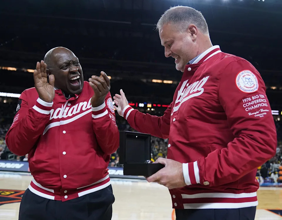 Pat Knight, son of former Indiana Hoosiers basketball coach Bob Knight, shares a laugh with Quinn Buckner as members of the 1976 Indiana Hoosiers basketball team are honored Monday, April 6, 2026, during the NCAA men’s basketball national championship game at Lucas Oil Stadium in Indianapolis.