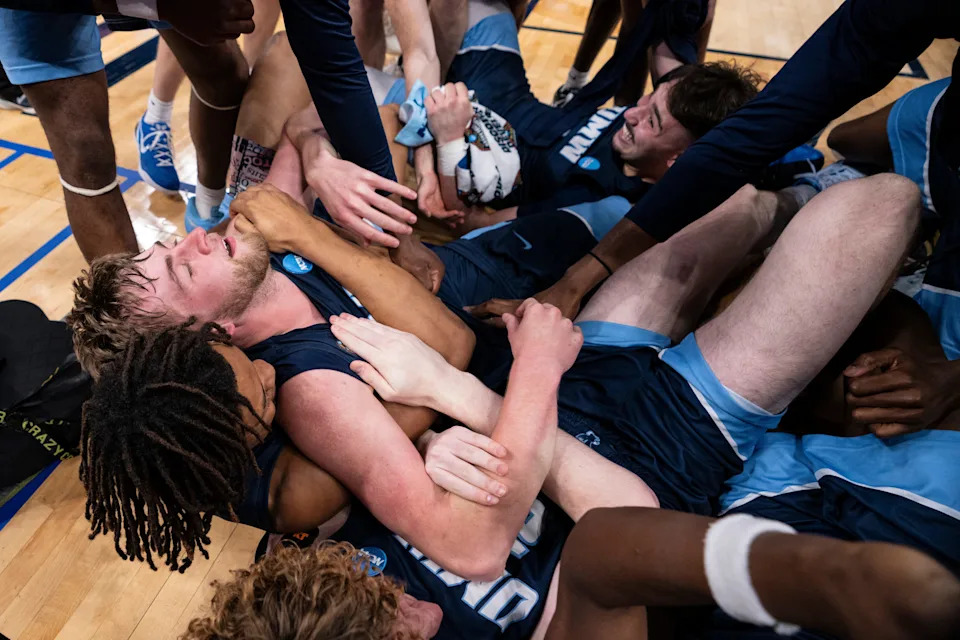 Mary Washington Eagles forward Colin Mitchell (25) celebrates with teammates after scoring a last second two-point lay-up to win the game Sunday, April 5, 2026, during the NCAA DIII men’s basketball championship game at Gainbridge Fieldhouse in Indianapolis.
