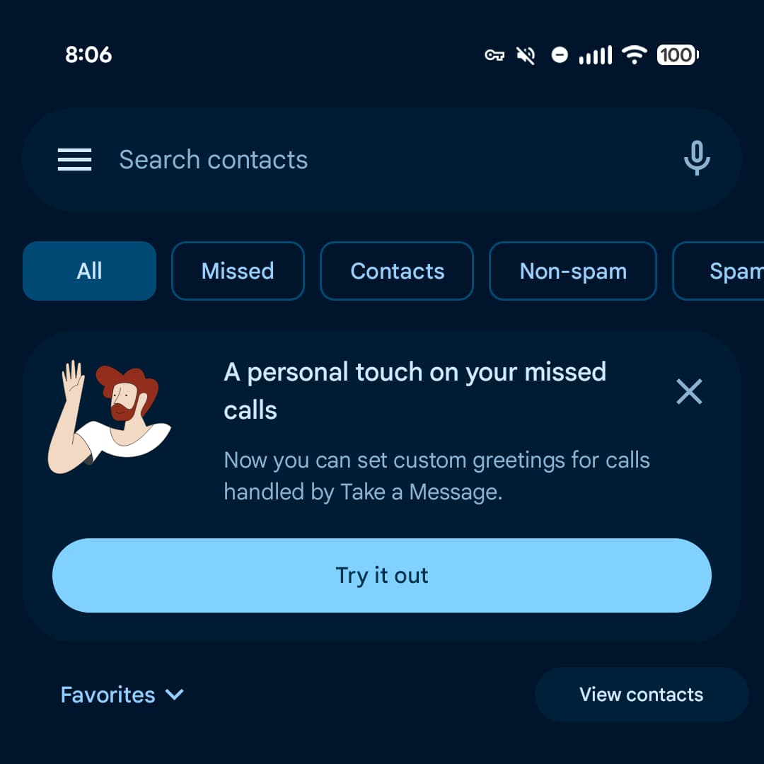 Once available, you’ll be prompted at the top of the Home tab to add “A personal touch on your missed calls” that are handled by Take a Message. You can also access custom greetings in the future by going to Settings > Take a Message.