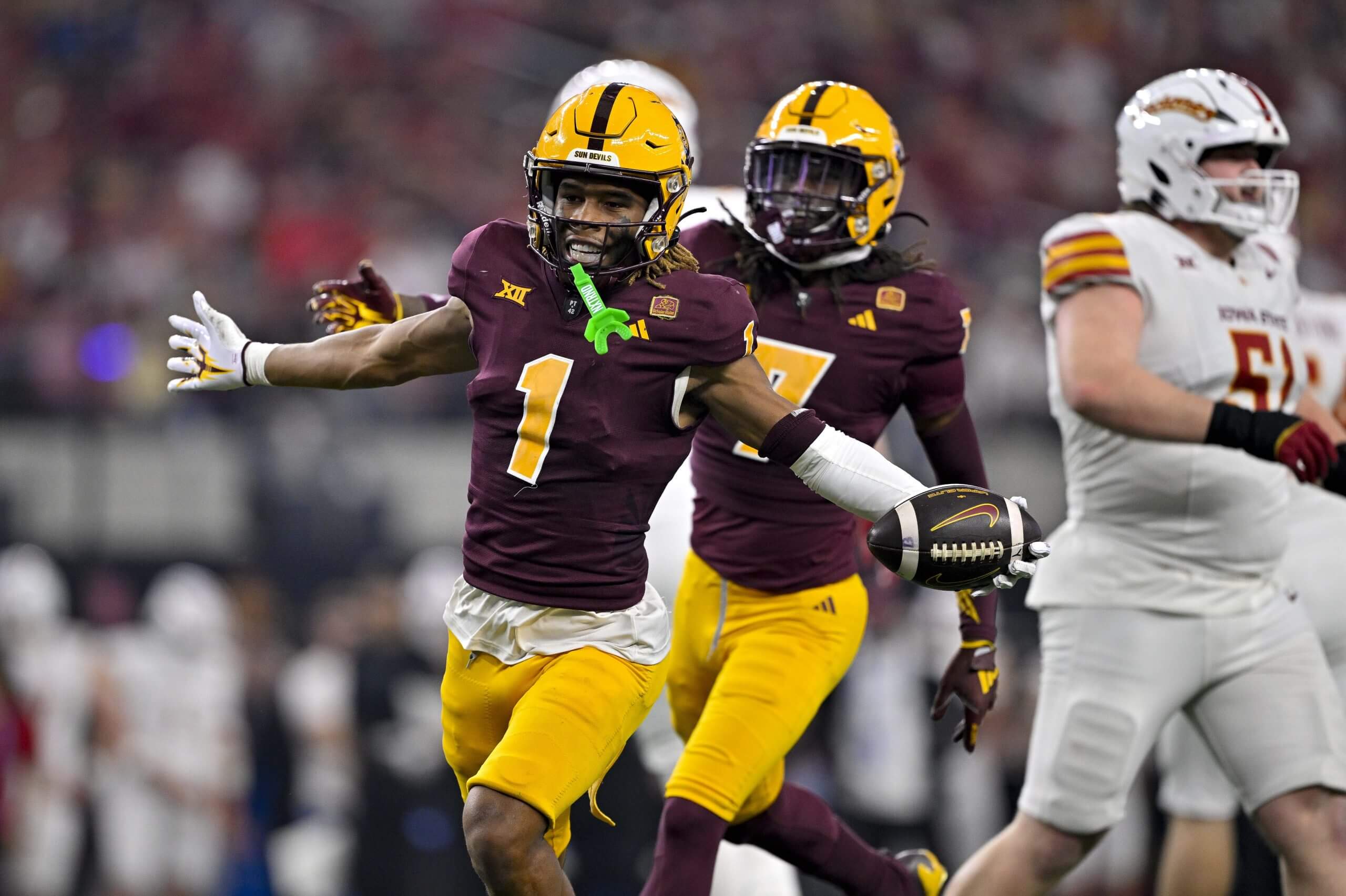 Arizona State Sun Devils defensive back Keith Abney II (1) celebrates after intercepting a pass against Iowa State in 2024. (Jerome Miron / Imagn Images)
