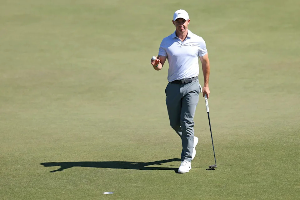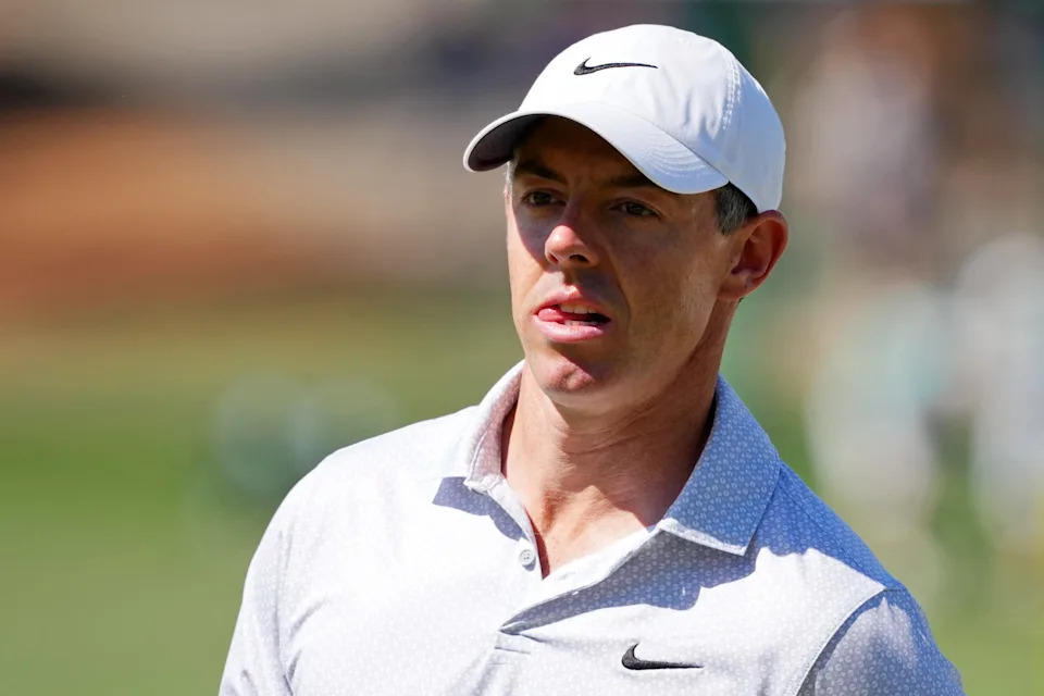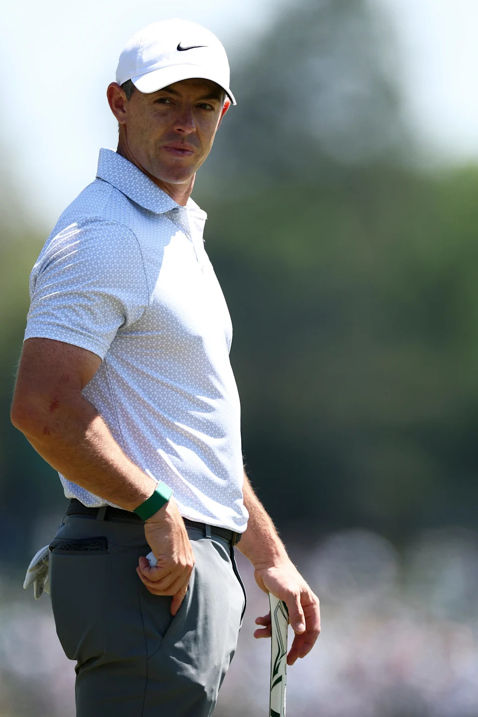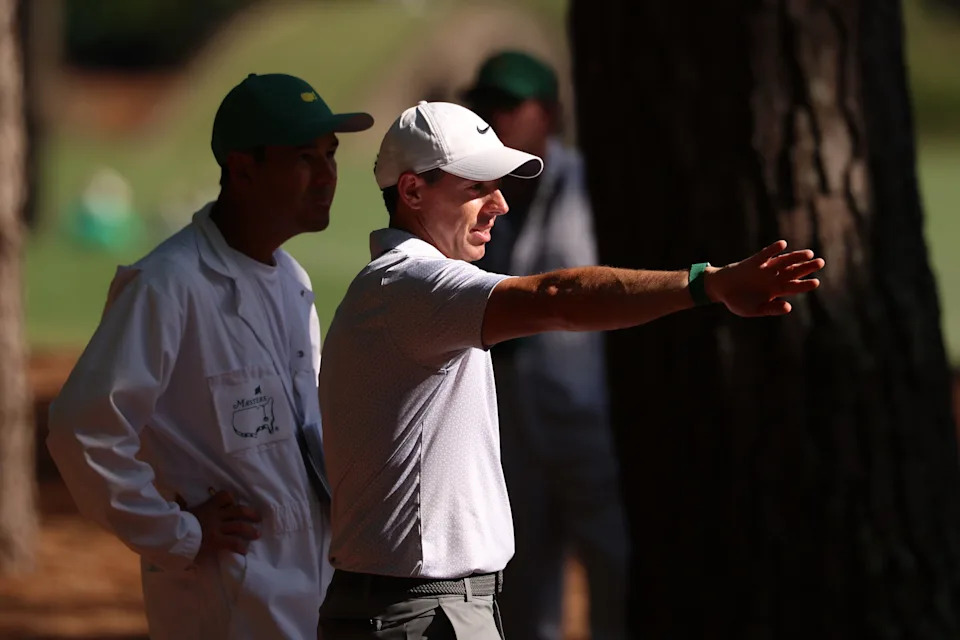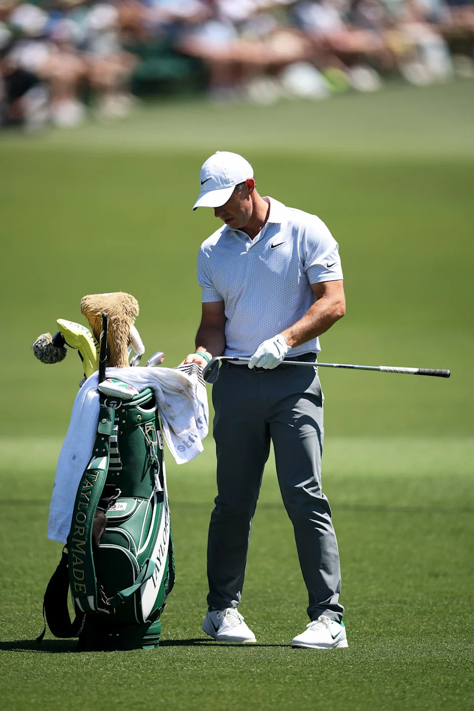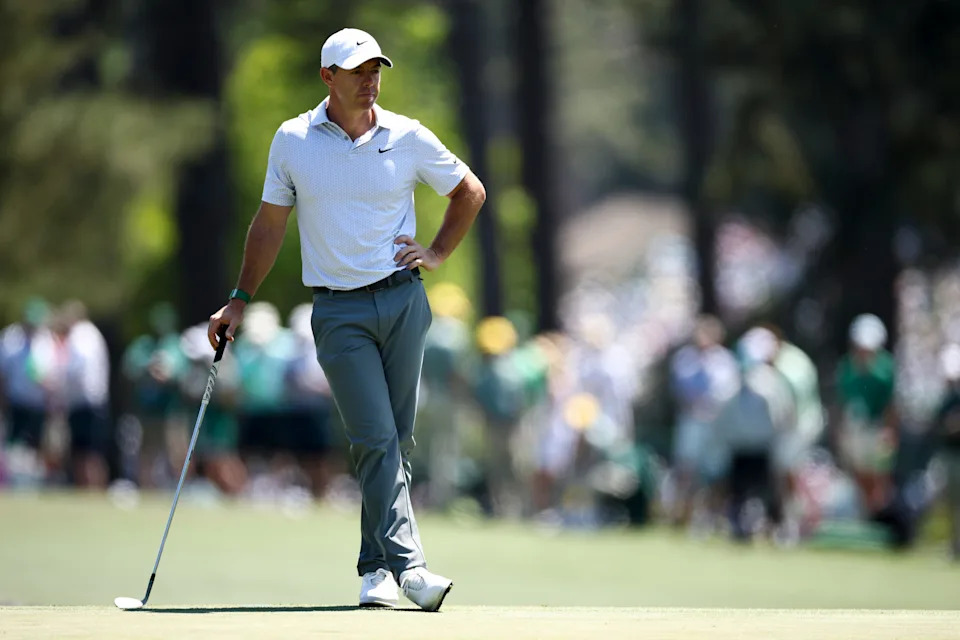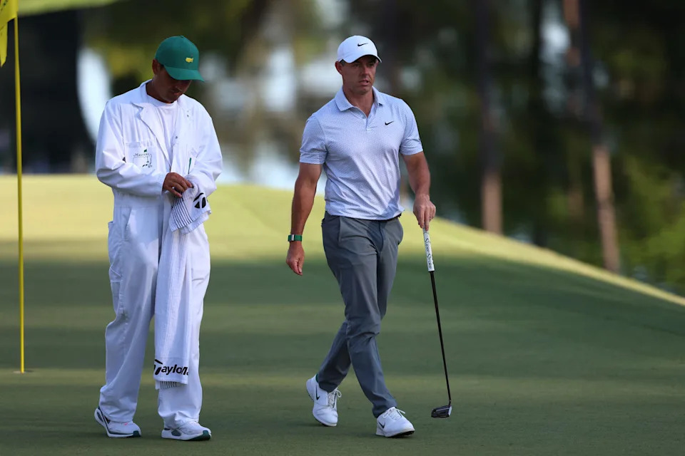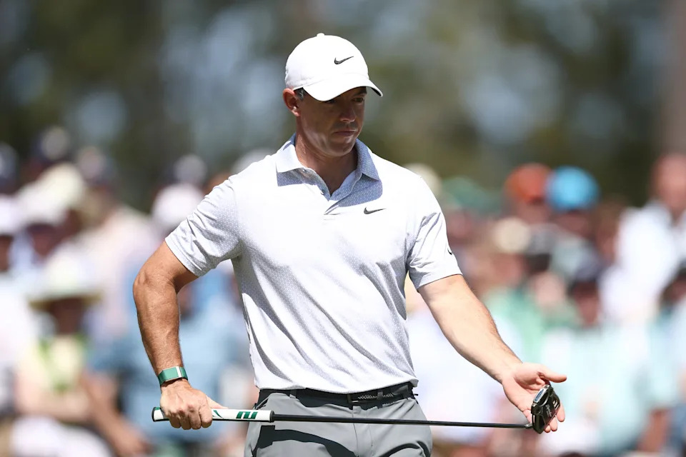 Rory McIlroy of Northern Ireland puts a club back in his bag during the second round of the 2026 Masters Tournament at Augusta National Golf Club on April 10, 2026, in Augusta, Georgia.