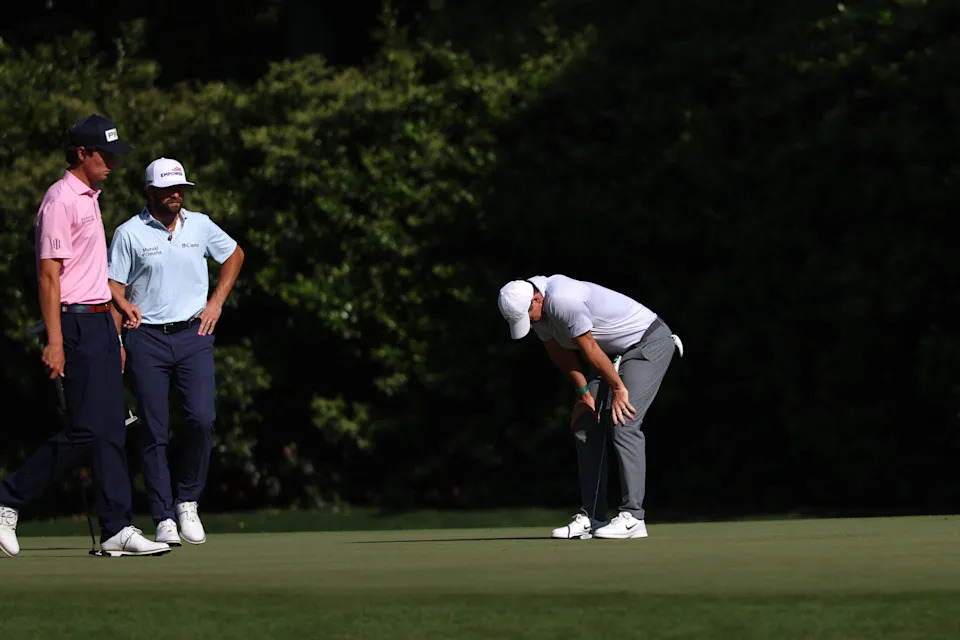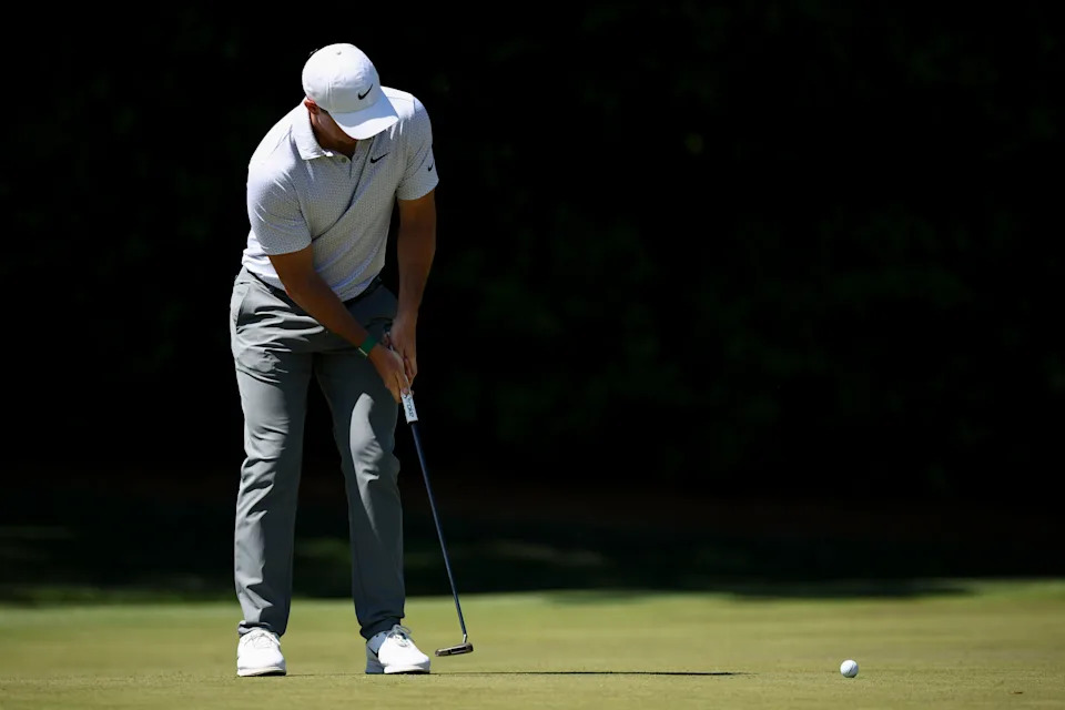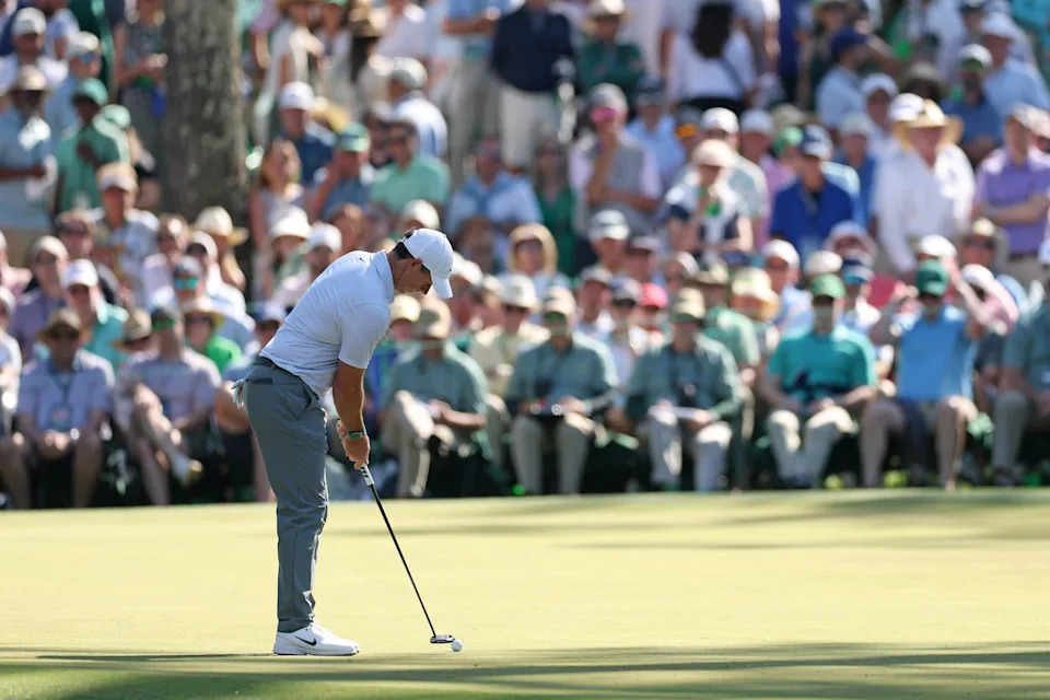 Rory McIlroy of Northern Ireland putts on the third green during the second round of the 2026 Masters Tournament at Augusta National Golf Club on April 10, 2026, in Augusta, Georgia.